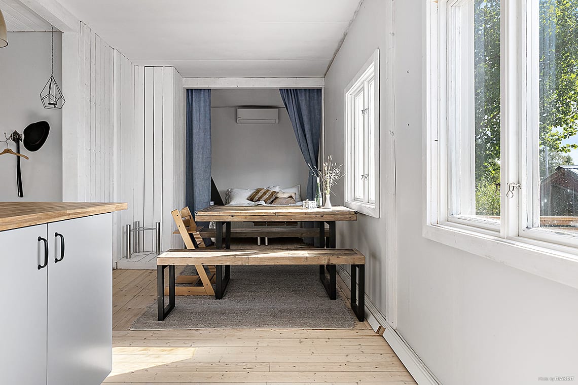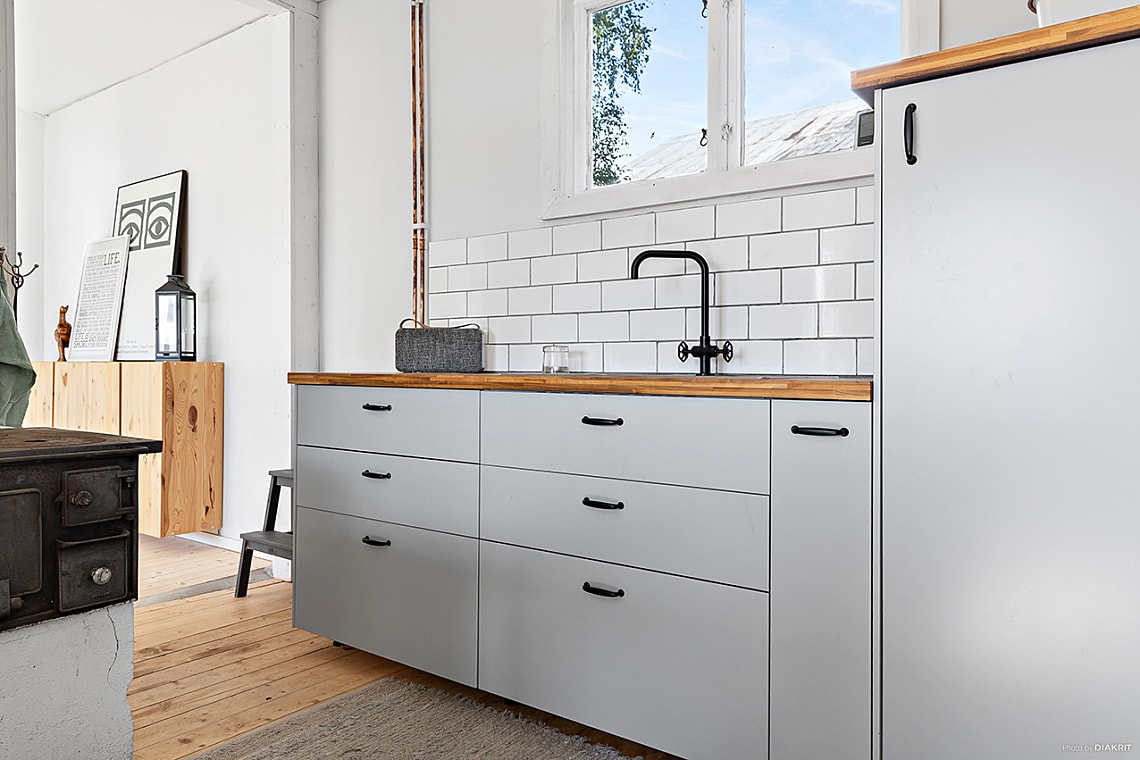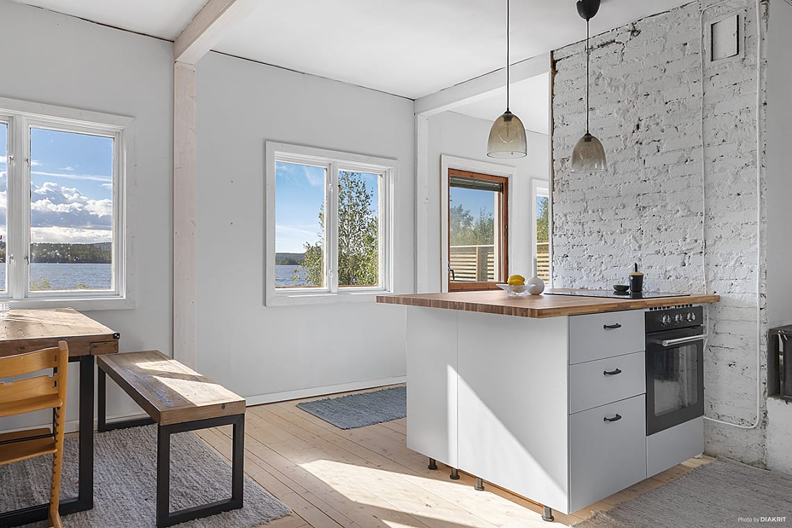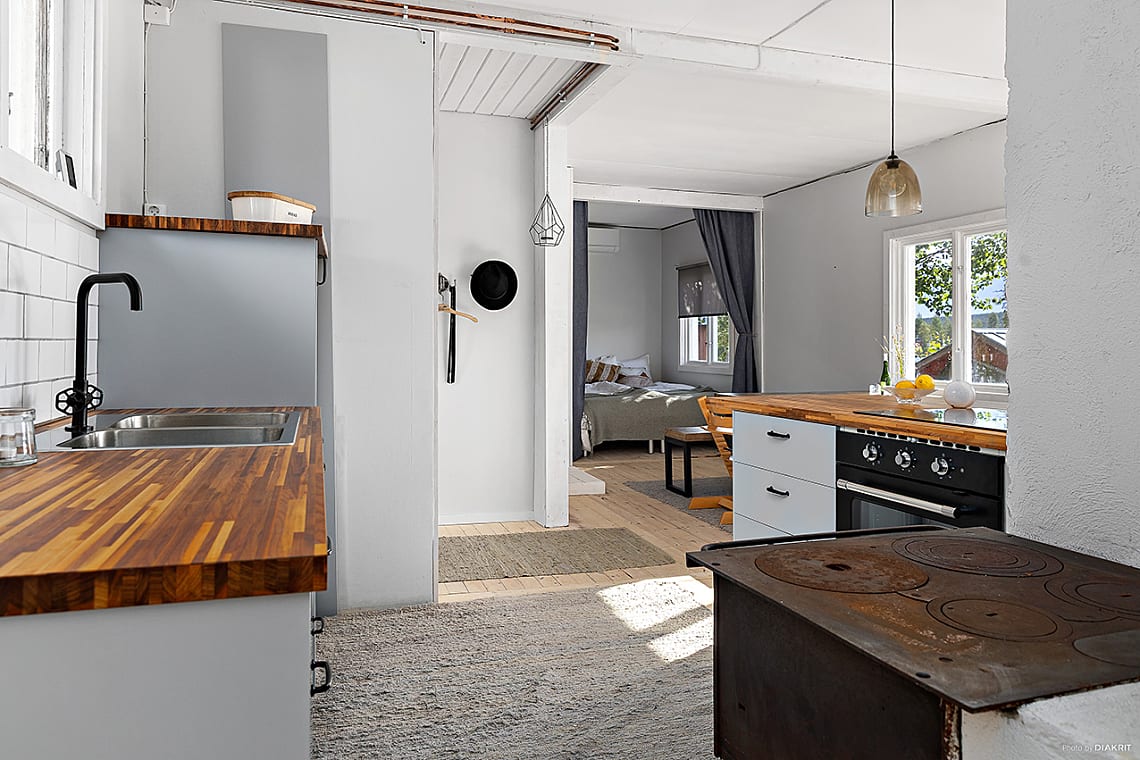 Ljust kök med släta köksluckor i ljus ton, svarta handtag och vitt kaklat stänkskydd. Utrustat med induktionshäll, varmluftsugn, vedspis samt kyl/frys. Trägolv och ljusa väggar skapar en harmonisk känsla. Plats finns för matgrupp vid fönstret med trevligt ljusinsläpp.