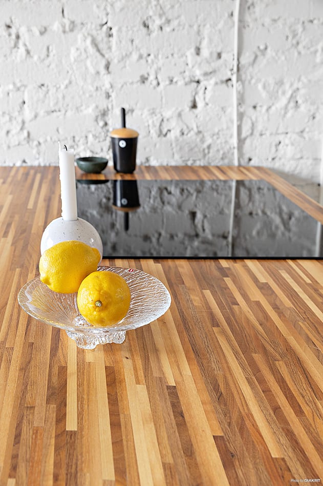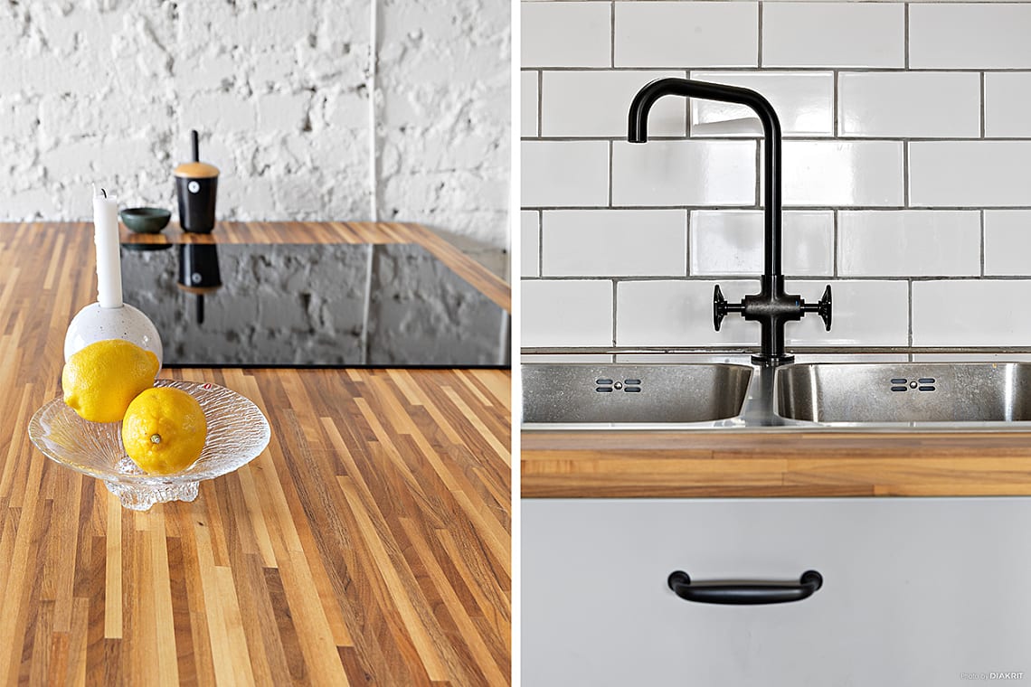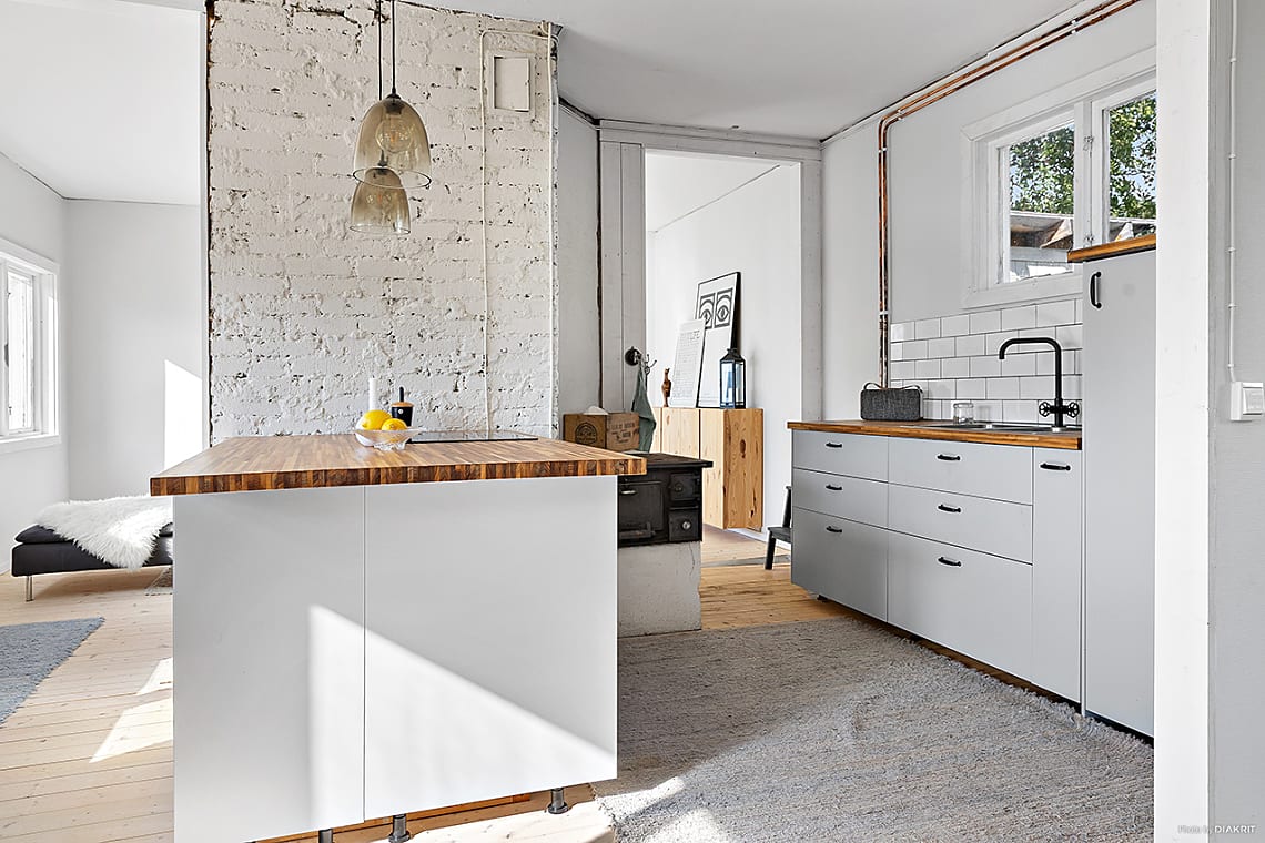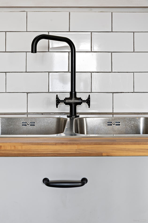 Ljust kök med släta köksluckor i ljus ton, svarta handtag och vitt kaklat stänkskydd. Utrustat med induktionshäll, varmluftsugn, vedspis samt kyl/frys. Trägolv och ljusa väggar skapar en harmonisk känsla. Plats finns för matgrupp vid fönstret med trevligt ljusinsläpp.