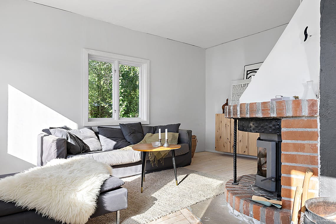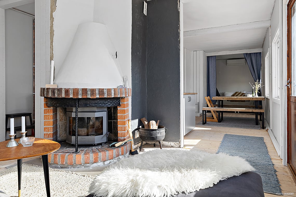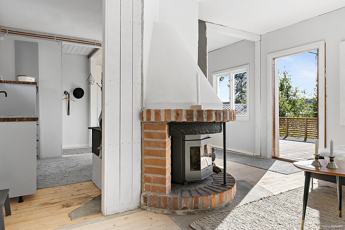 Rymligt vardagsrum med kamin och plats för soffgrupp och tillhörande möbler. Delvis öppen planlösning mot köket, trägolv och ljusa väggar. Härifrån nås även den stora uteplatsen.