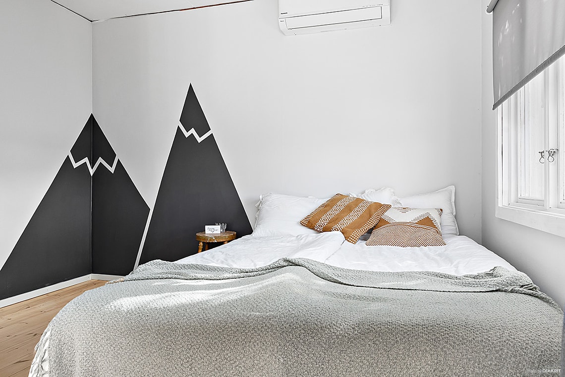 Sovrum med plats för dubbelsäng och möbler. Trägolv och ljusa väggar.