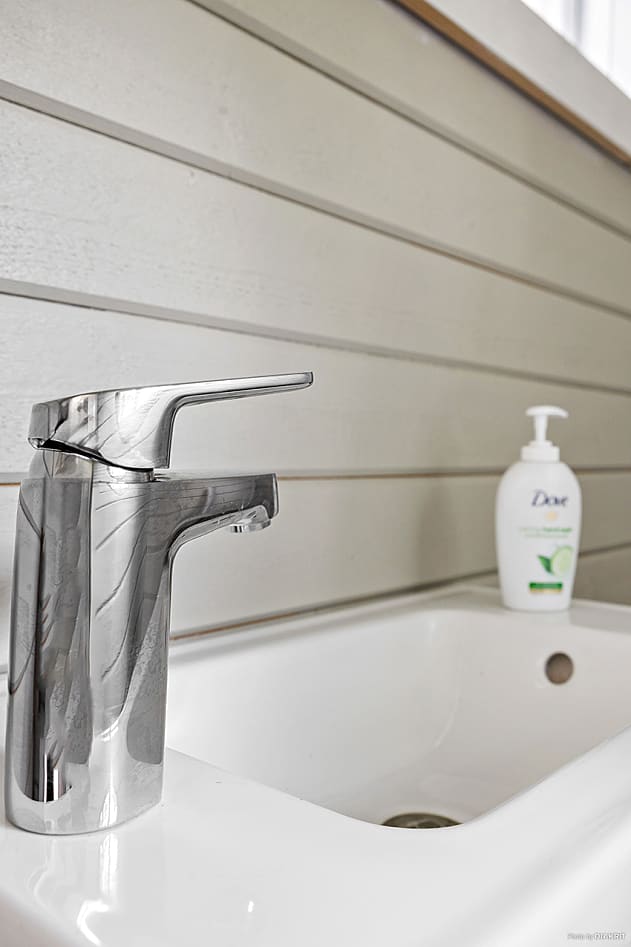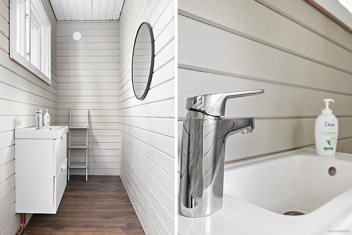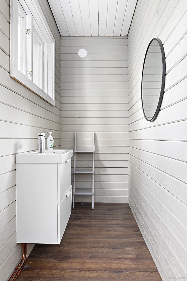 Nuvarande handfat och klickgolv med väggpanel. Vatten finns för anslutning av duschkabin om önskas.