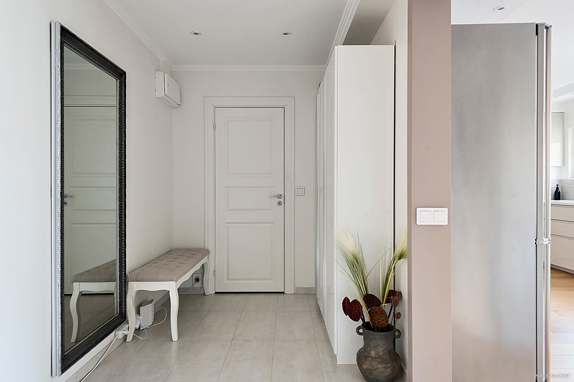 Välkomnande och möblerbar hall med goda förvaringsmöjligheter. Här finns plats för både avhängning och hallmöbel. Golvet pryds av ljust, praktiskt klinker i stora sandfärgade plattor som ger ett stilrent och tåligt första intryck. Ljusa väggar och infällda spotlights i taket skapar en modern och trivsam atmosfär. Förvaring i garderober bidrar till en ordnad och funktionell entré.