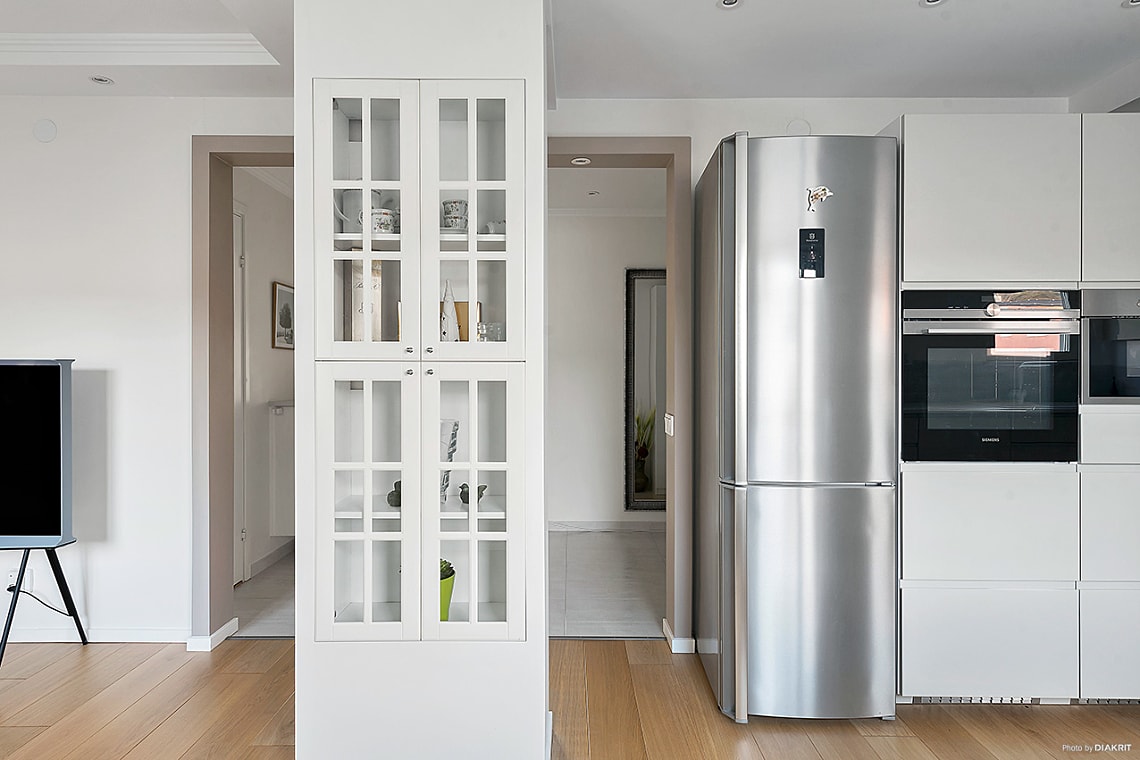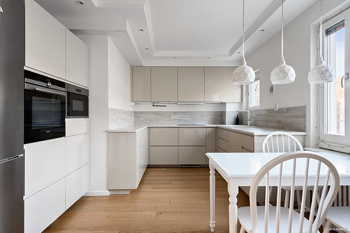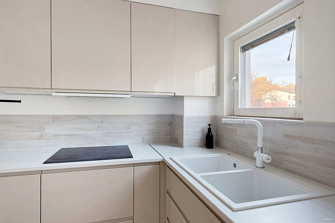 Stilrent och välutrustat kök i öppen planlösning mot vardagsrummet. Trägolv med breda tiljor och ljusa väggar ger en varm och inbjudande känsla. Köket är utrustat med rostfri kombinerad kyl och frys, inbyggnadsugn och mikro. Skåpssnickerier i högblankt vitt och beige samspelar elegant med den vita arbetsbänken. Induktionshäll och fläkt samt infällda spotlights i takets nedsänkning ger både funktion och design. Fönster ovanför den vita diskhon släpper in fint ljus och här finns en naturlig plats för matbord vid fönstret.