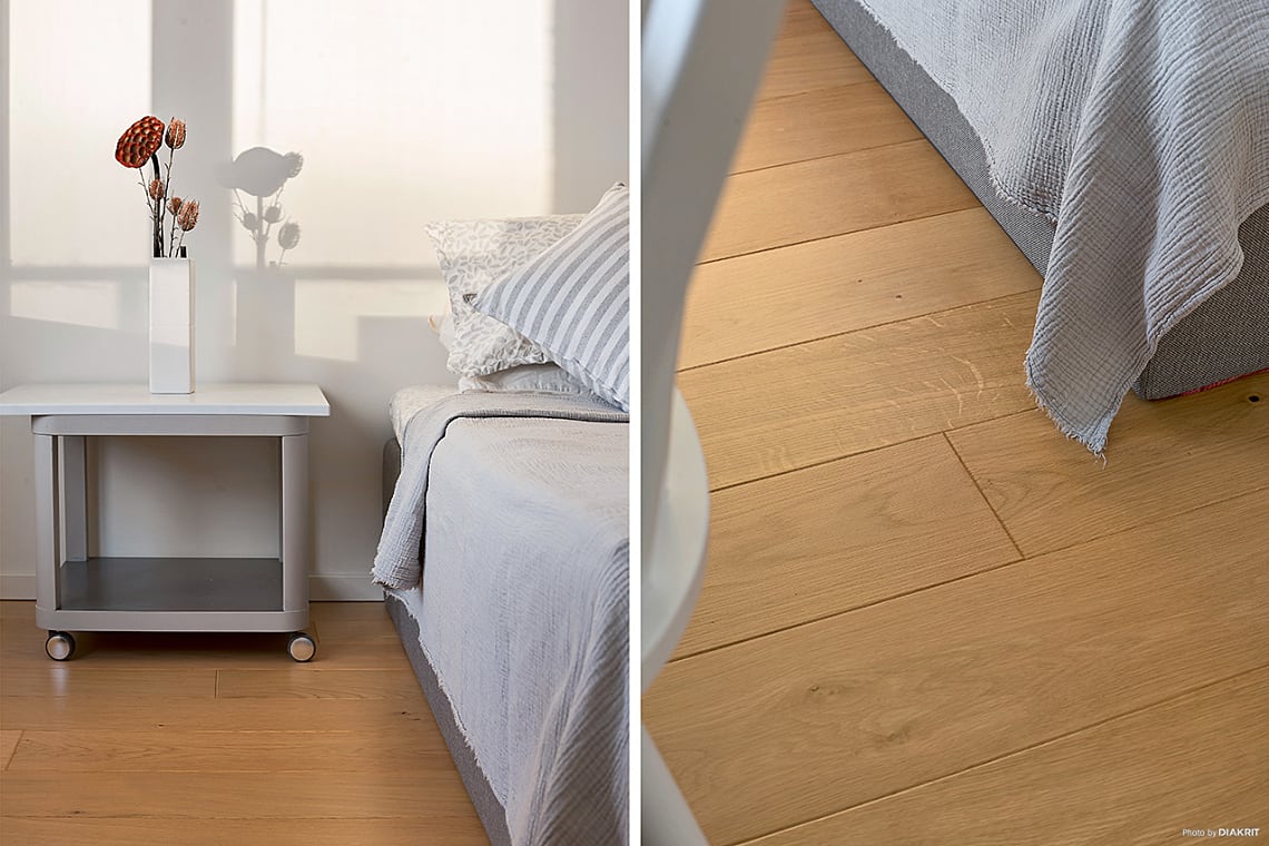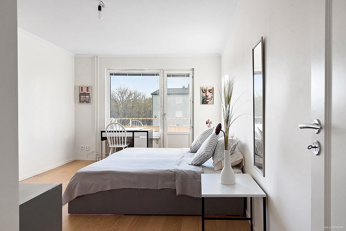 Rofyllt sovrum med parkettgolv och vita väggar. Här finns plats för dubbelsäng med tillhörande sängbord samt skrivbord. Utgång till balkong ger extra ljusinsläpp och en härlig förlängning av rummet.