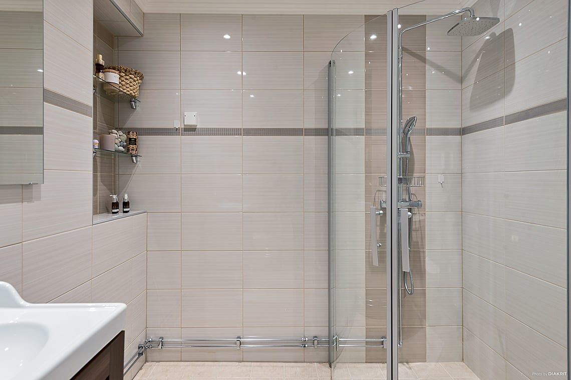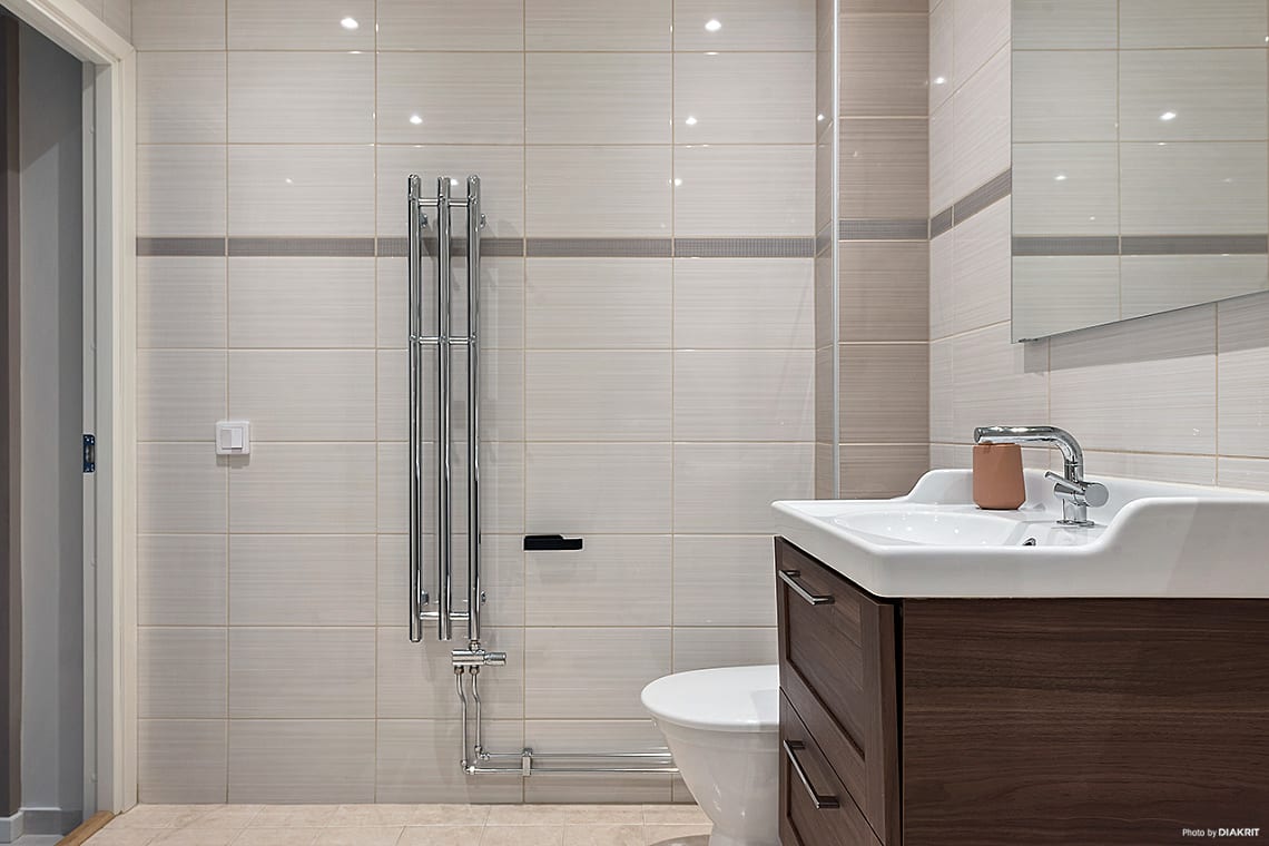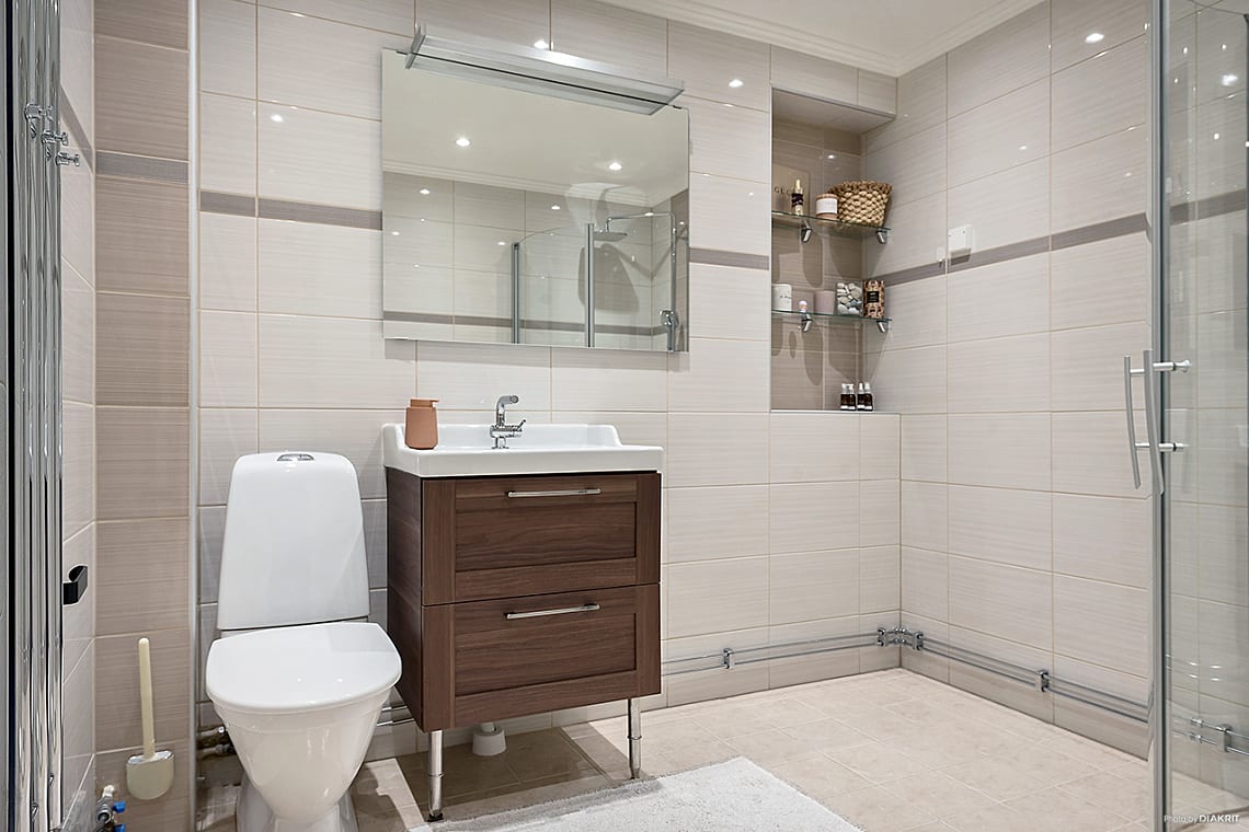 Lyxigt helkaklat badrum med sandfärgade plattor på både väggar och golv som ger en varm och elegant hotellkänsla. Infällda spotlights och en stilren, inbyggd hylla med glasplan. Förberett för tvättpelare. Stor väggspegel ovanför handfat med brun kommod. WC, takdusch med vikbara glasdörrar samt handdukstork som höjer komforten ytterligare.