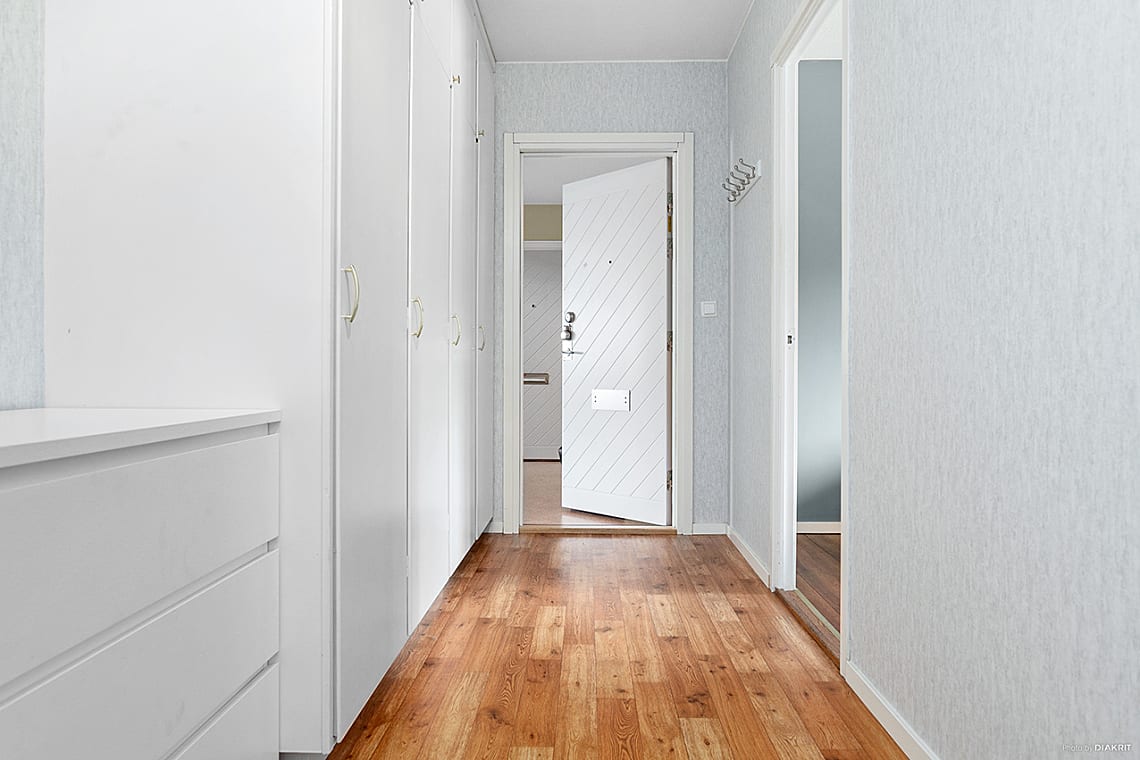 Hall med plats för avhängning och gott om förvaring i flertalet garderober.