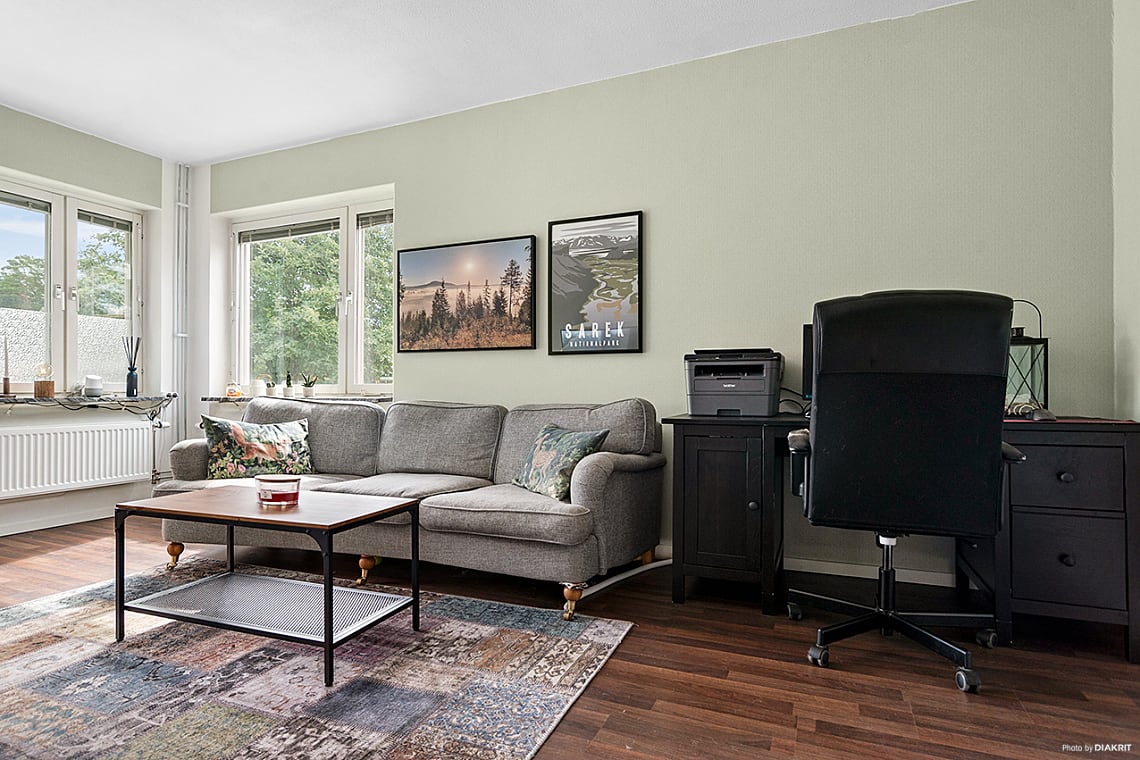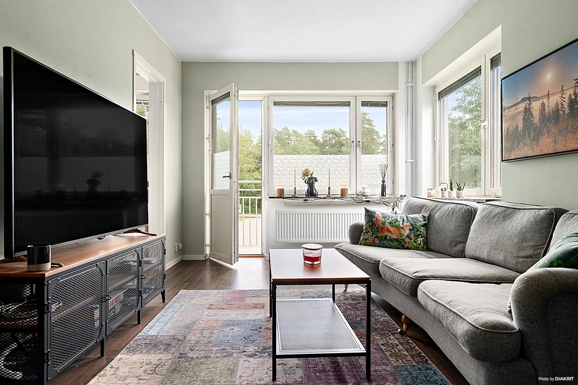 Ljust vardagsrum med stora fönsterpartier i vinkel och utgång till balkong. Rummets rymd ger plats för soffgrupp och tillhörande möbler.