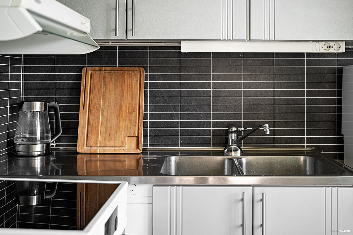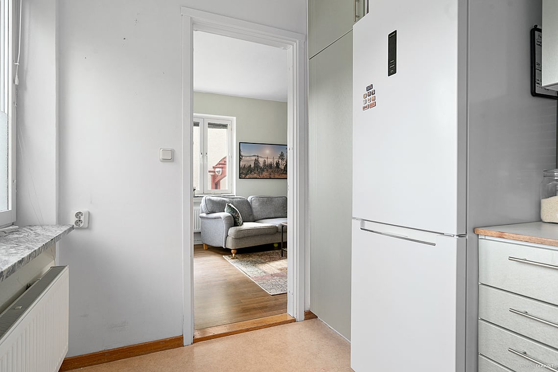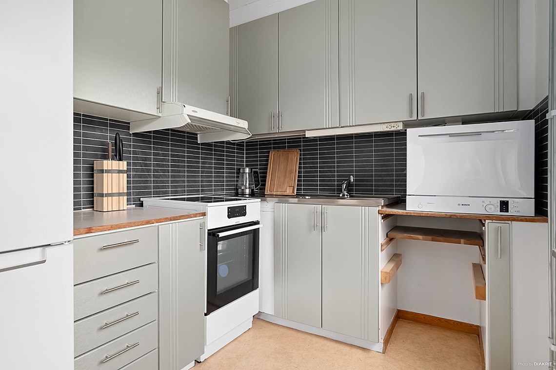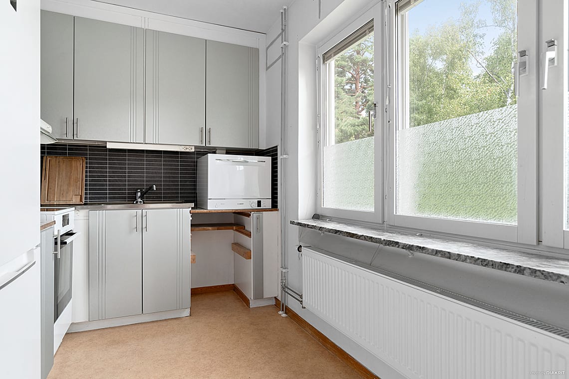 Mindre kök med flera fönster som ger ett fint ljusinsläpp. Köket är utrustat med ugn och spishäll, fläkt, bänkdiskmaskin samt kombinerad kyl/frys.