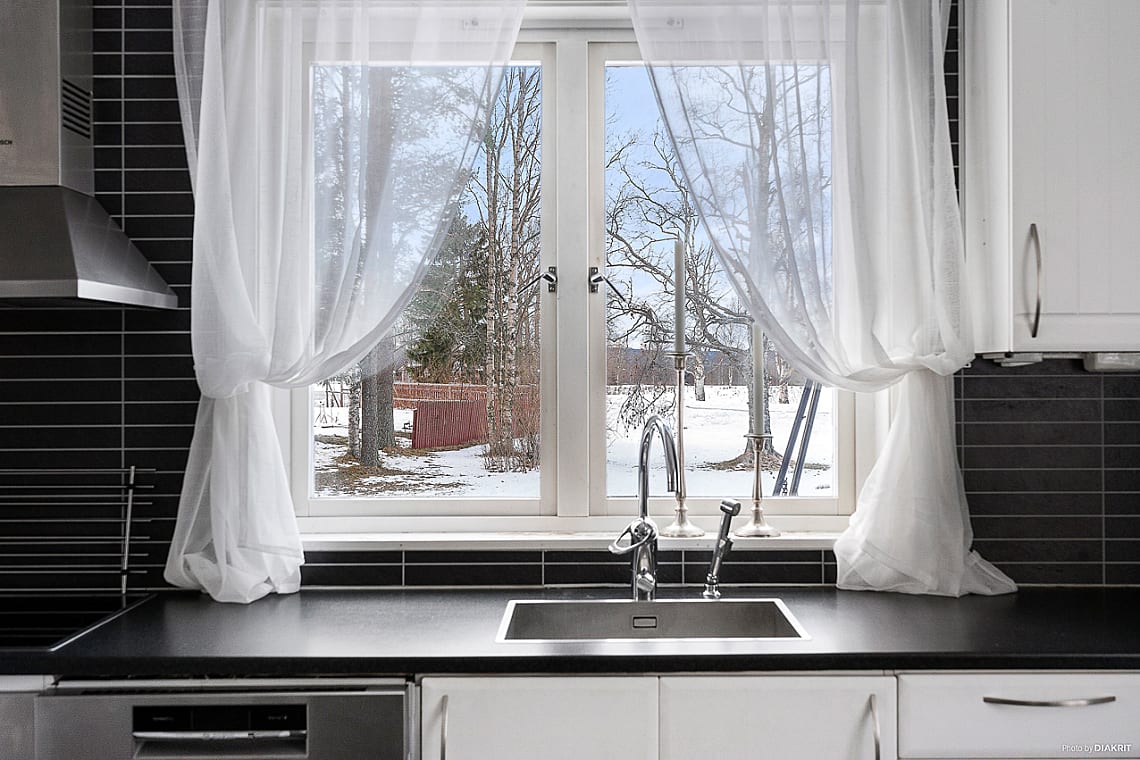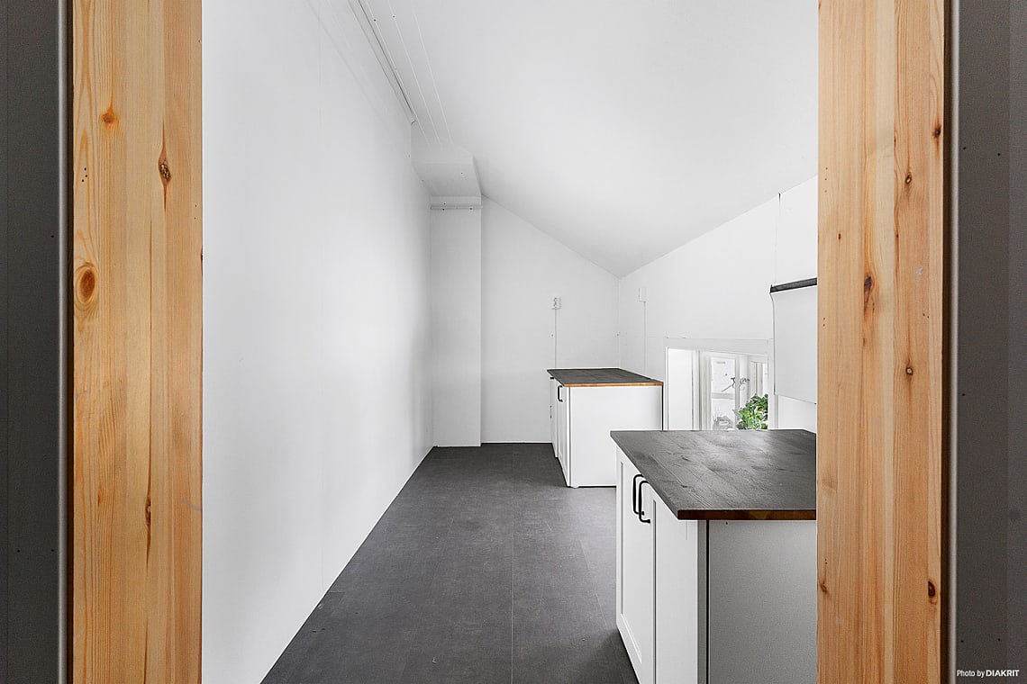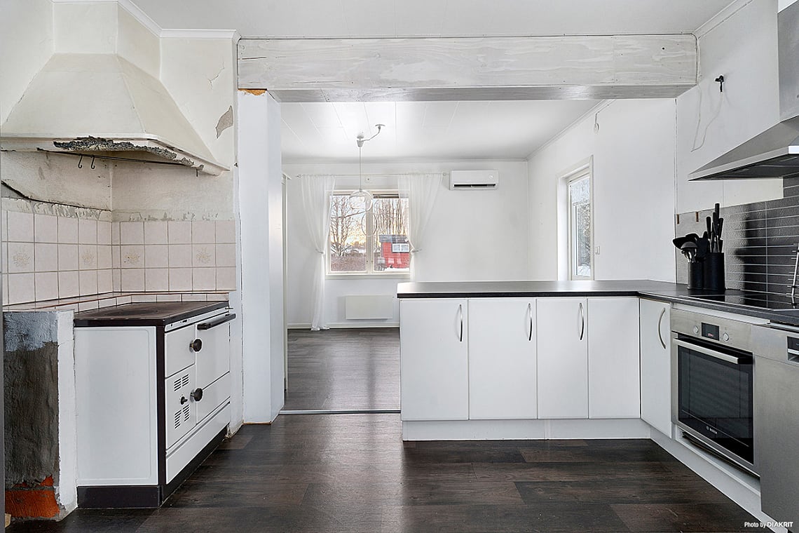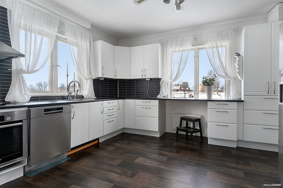 Modernt och funktionellt Härjedalskök med gott om förvaring i överskåp och skåpluckor. Utrustat med diskmaskin, ugn, induktionshäll, fläkt, kyl/frys och diskho. Kökets vedspis ger en charmig och rustik känsla. Svart kaklat stänkskydd och laminatgolv som harmonierar med de vita väggarna.