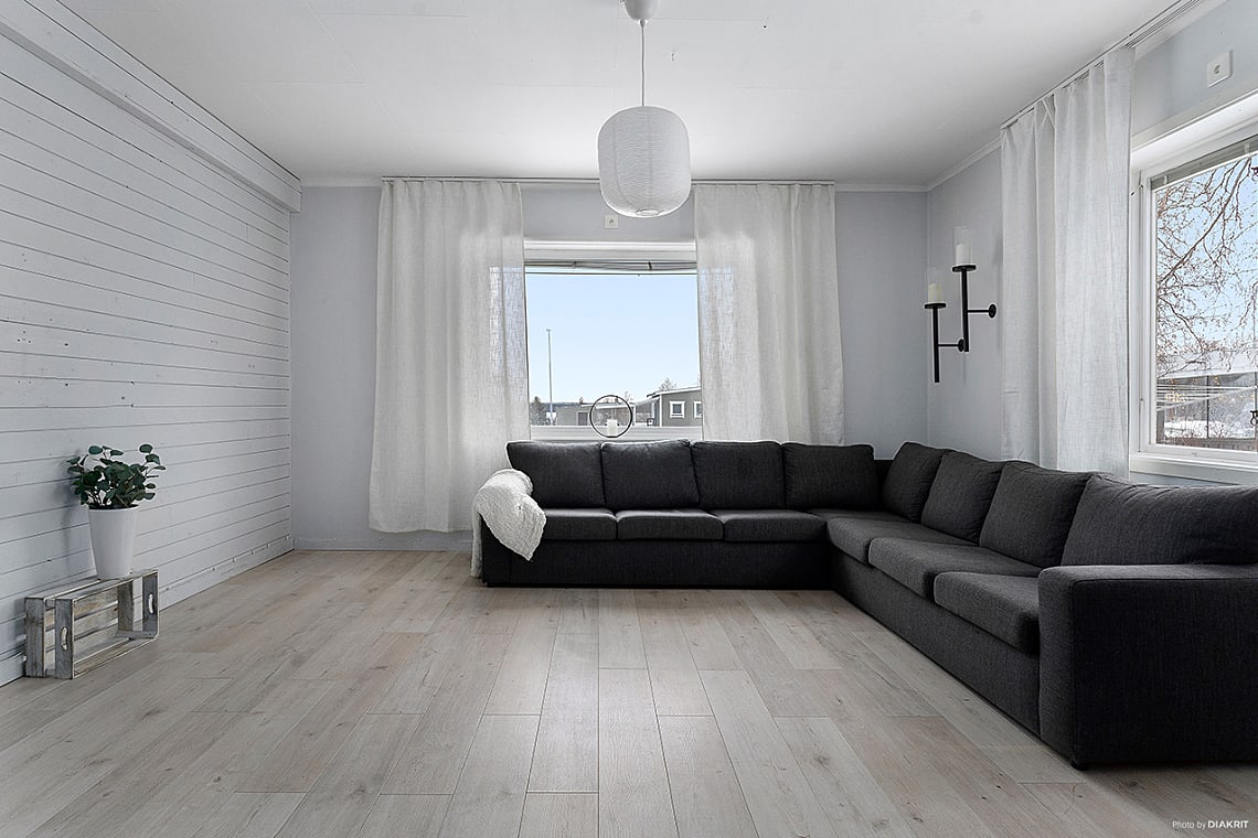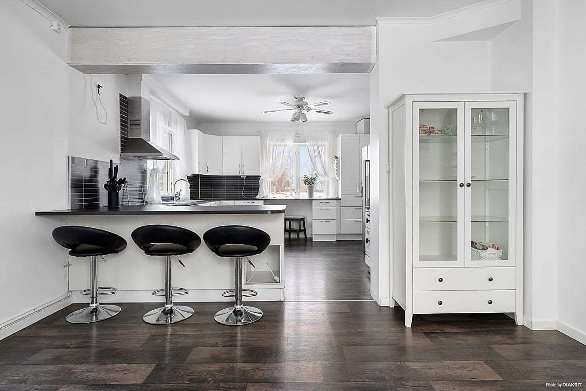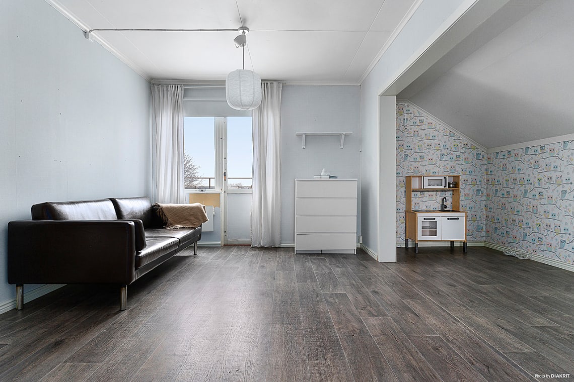 Ligger i direkt anslutning till köket med samma laminatgolv och vita väggar. Här finns en luft-luftvärmepump för behagligt inomhusklimat samt en altandörr som leder ut till uteplatsen. Det finns även plats för barstolar för en flexibel matplatslösning.