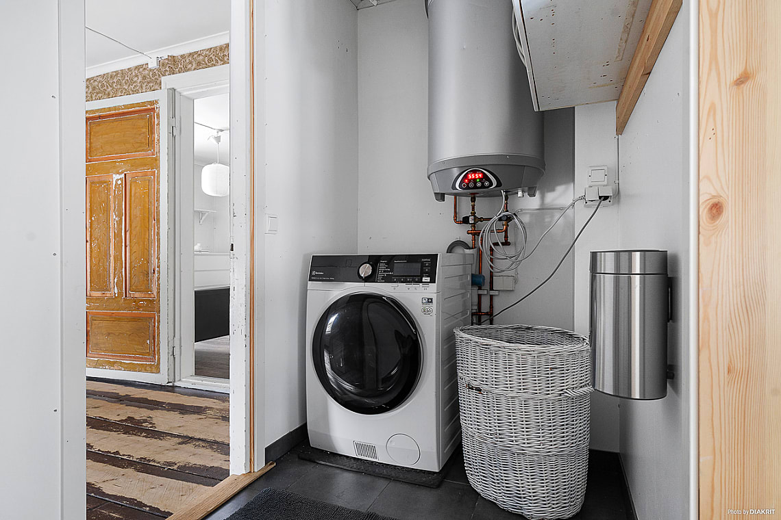 Praktisk tvättstuga utrustad med kombinerad tvättmaskin och torktumlare, tvättlina och arbetsbänkar med förvaringsskåp. Här finns även varmvattenberedaren placerad ovanför tvättmaskinen.