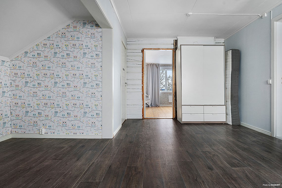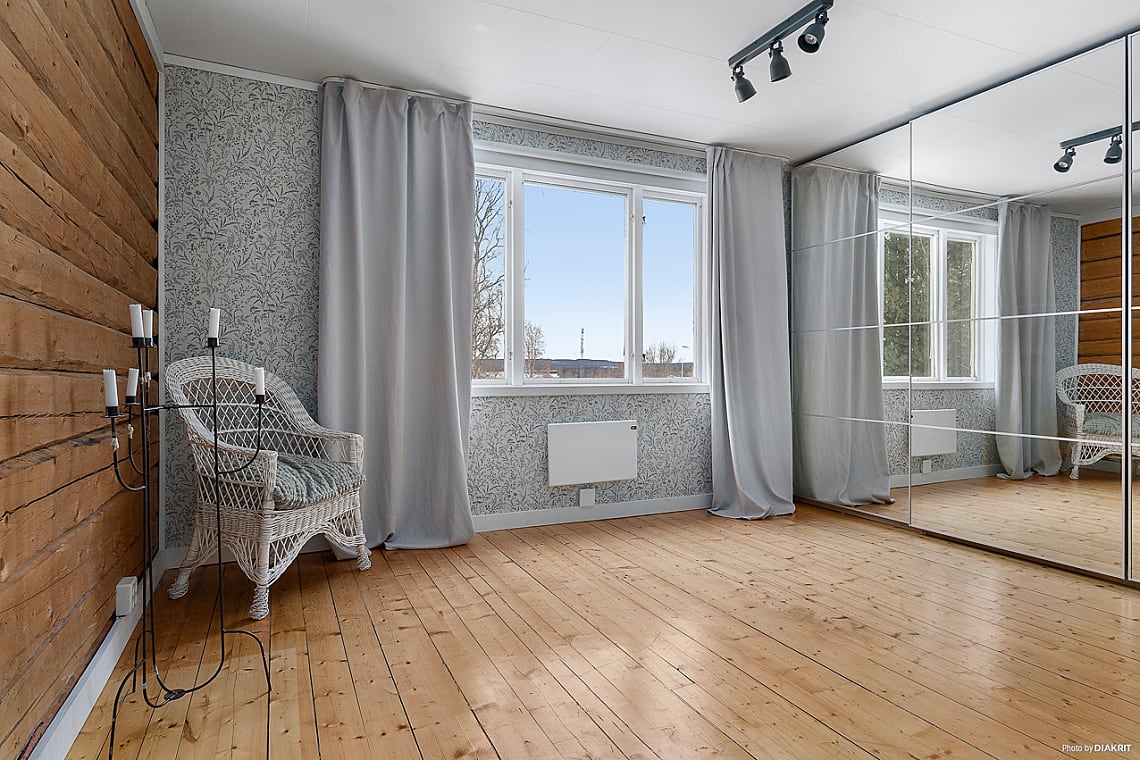 Charmigt sovrum med trägolv och en kombination av träväggar och tapetserade väggar. Längs med ena väggen finns stora spegelgarderober som ger gott om förvaring.