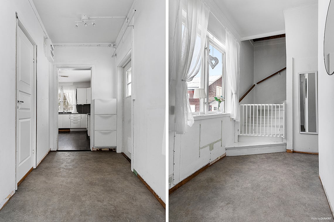 Välkomnande hall med grå plastmatta och vitmålade väggar. Under trappan finns en praktisk förvaringslucka. Här har du komfortabel golvvärme, som även sträcker sig till vardagsrum och badrum. Förberett med framdragna slangar för kök och matplats.