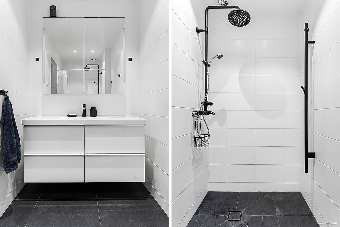 Smakfullt inrett badrum med svart klinkergolv och vita kaklade väggar. Utrustat med bred handfatskommod, spegelskåp, WC, dusch och handdukstork. Här ligger golvvärme.