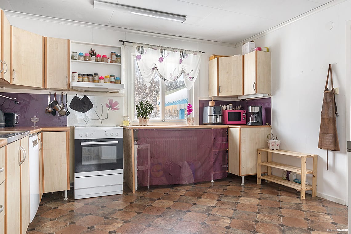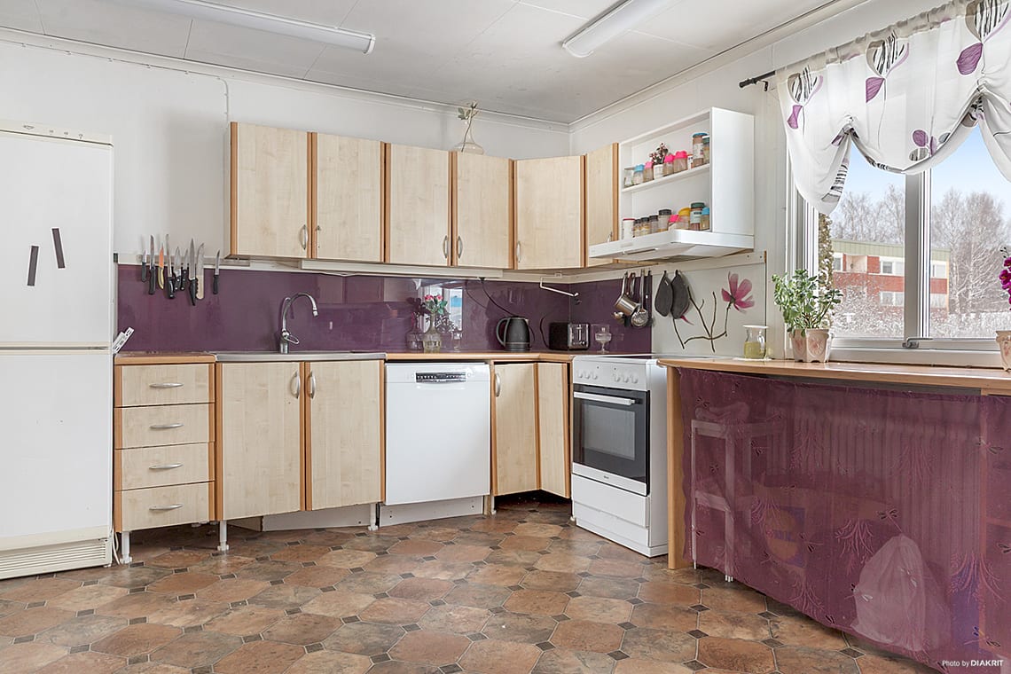 Ett rymligt och funktionellt kök med generös bänkyta och gott om förvaringsmöjligheter. Köket är utrustat med kombinerad ugn och spishäll, fläkt, diskmaskin samt kyl och frys. Ljust målade väggar och slitstark plastmatta på golvet.