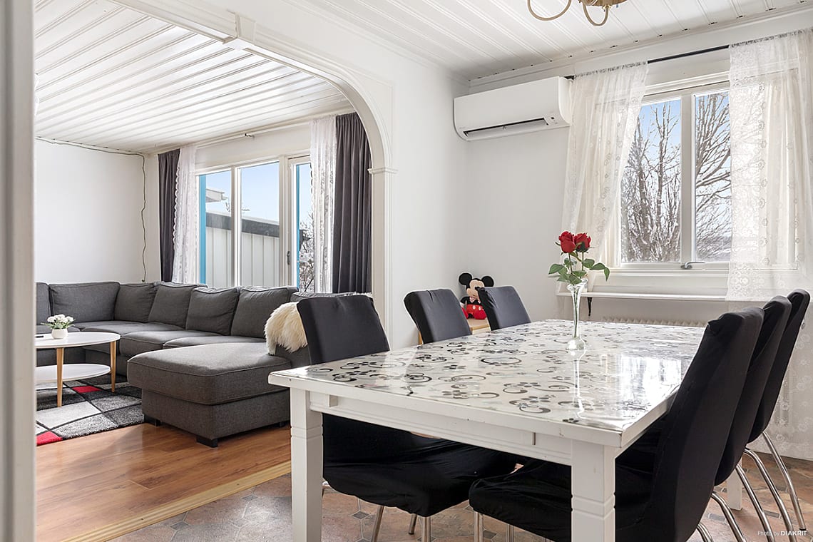 Ett luftigt och inbjudande matrum med plats för ett större matbord. Den öppna planlösningen mot vardagsrummet skapar en social och rymlig känsla. Vita väggar och plastmatta på golvet.