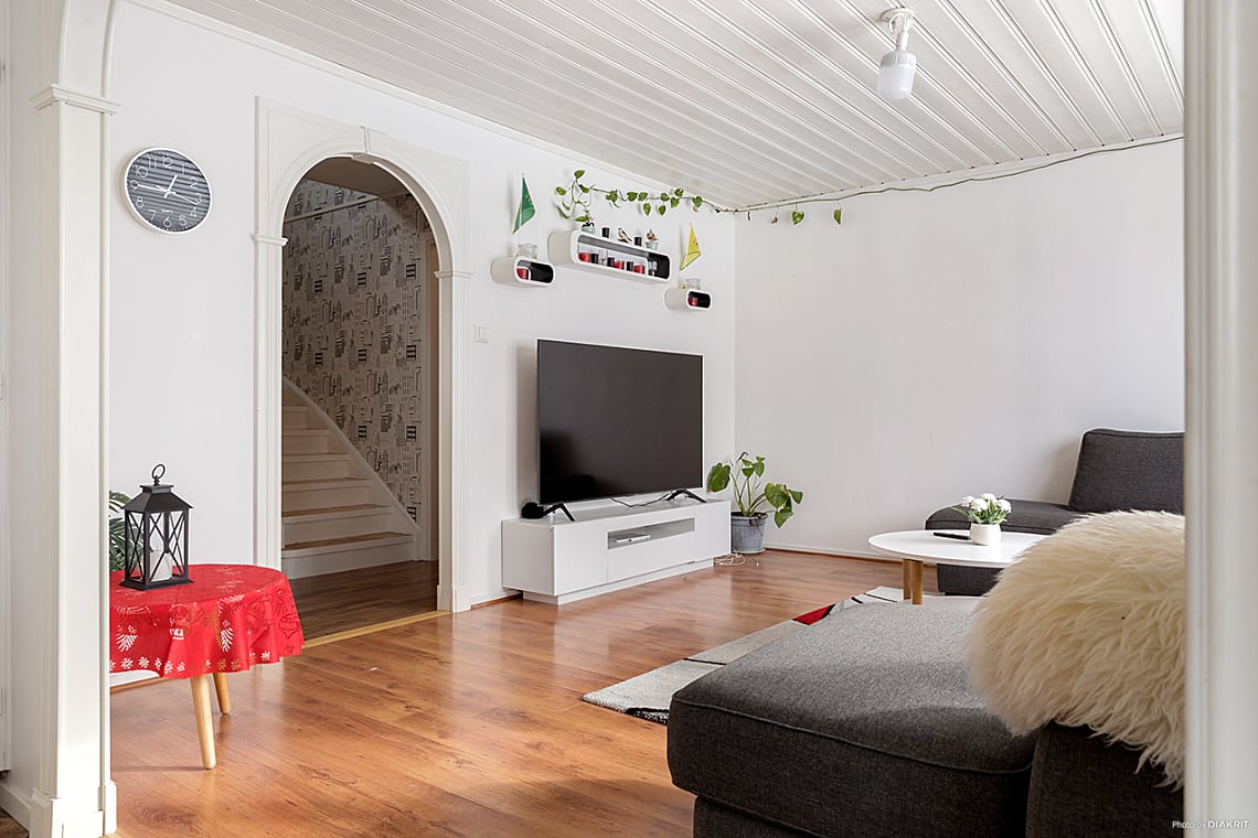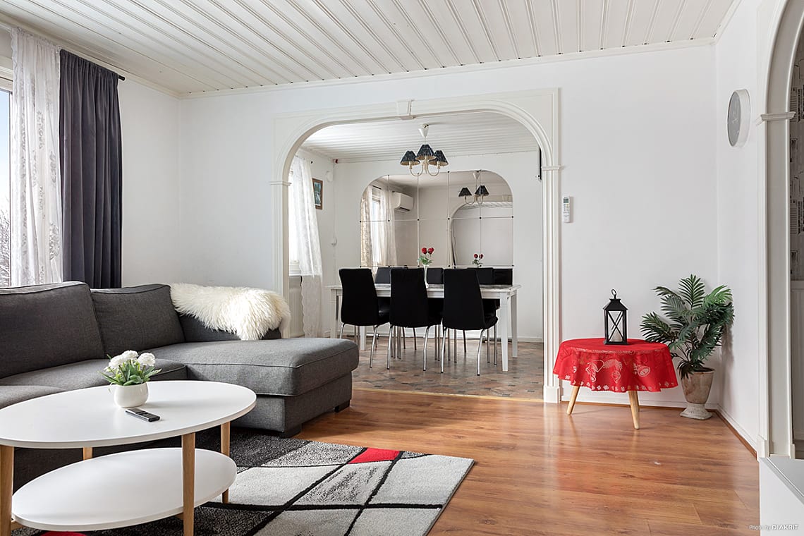 Ett stort och ljust vardagsrum med plats för soffgrupp och övriga möbler. Här finns en altandörr som leder ut till altanen och den grönskande trädgården, vilket förlänger rummet och ger härligt ljusinsläpp. Golvet är klätt i slitstarkt laminat och väggarna är målade i vitt.
