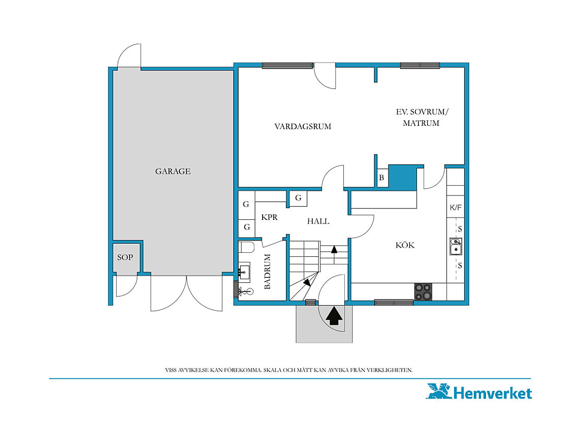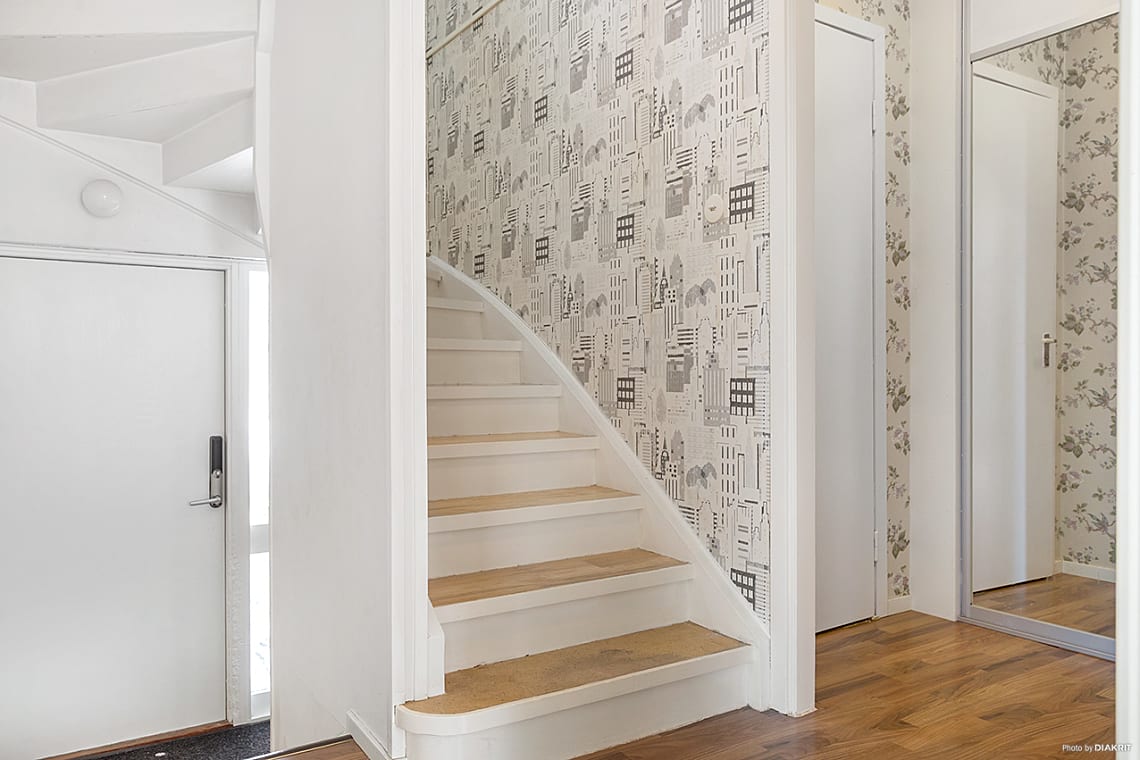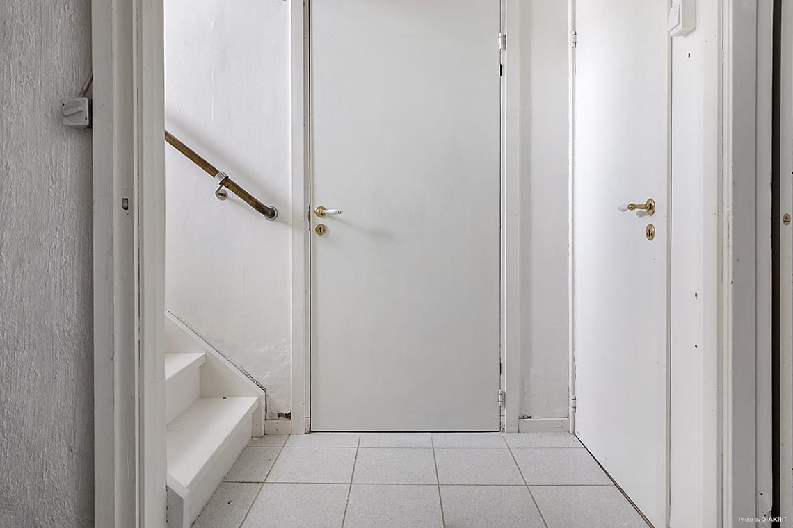 En halv trappa upp välkomnas du av en ljus och rymlig hall med gott om förvaring i två garderober med spegeldörrar. Här finns även trappan som leder både till källaren och övre plan.