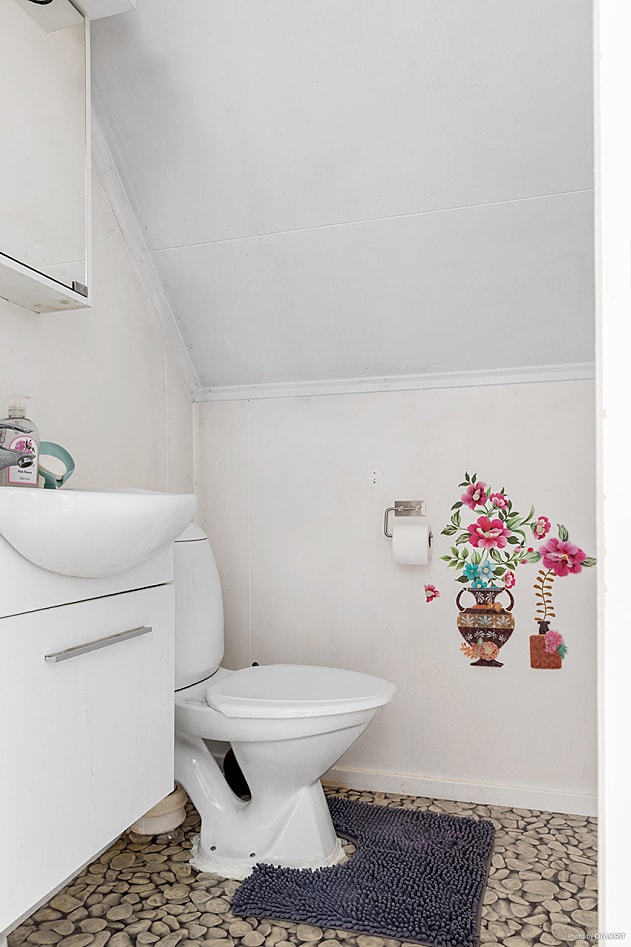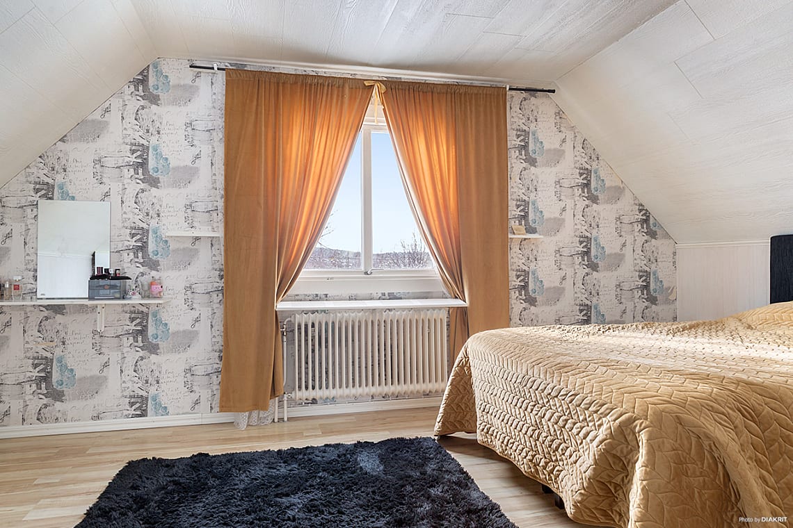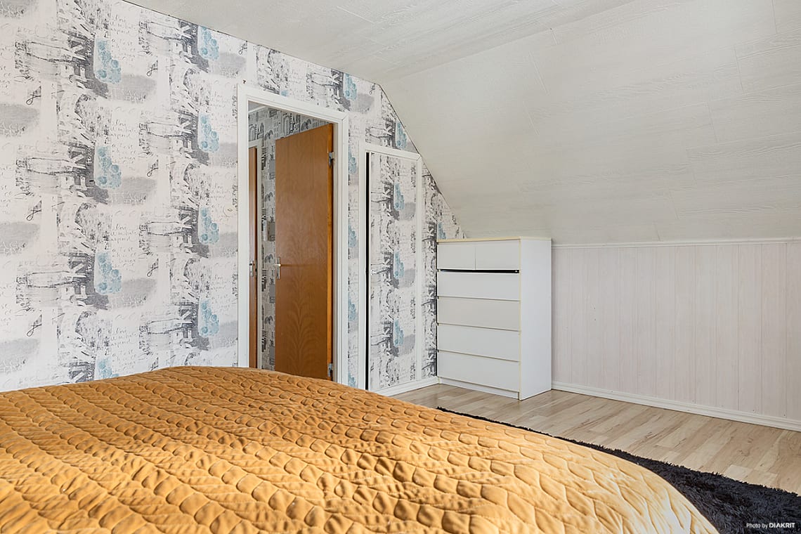 Rymligt och rofyllt sovrum med plats för dubbelsäng, sängbord och en läshörna. Ljust golv och tapetserade väggar ger en varm och harmonisk känsla. Här finns även en liten klädkammare.