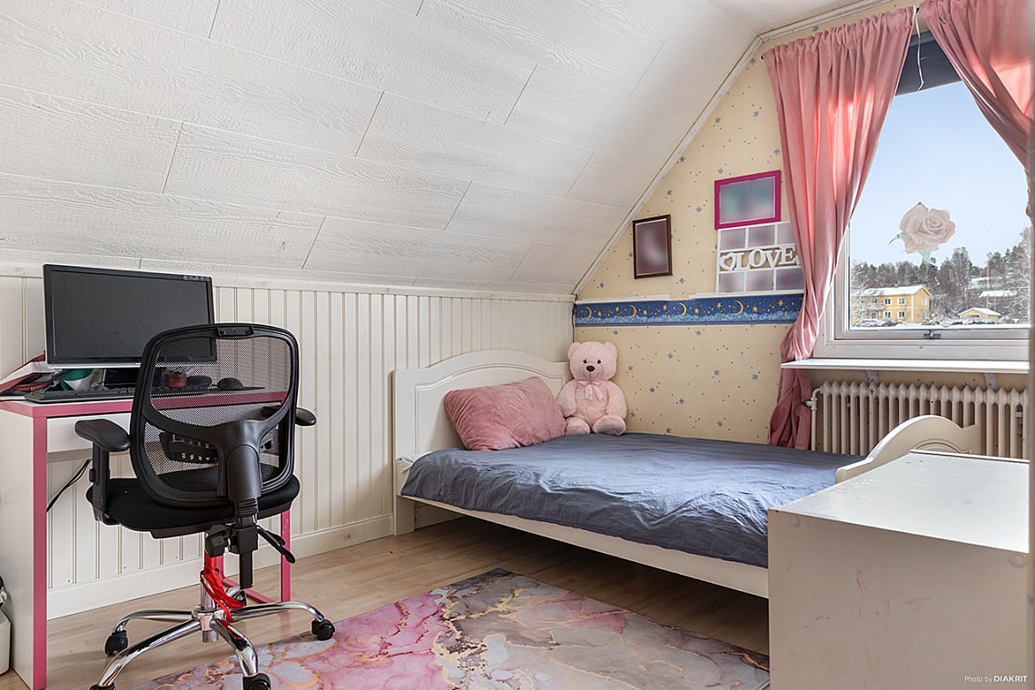 Mysigt sovrum med ljusa golv, väggpanel och tapetserade väggar. Här finns plats för både säng och skrivbord, samt en praktisk inbyggd garderob.