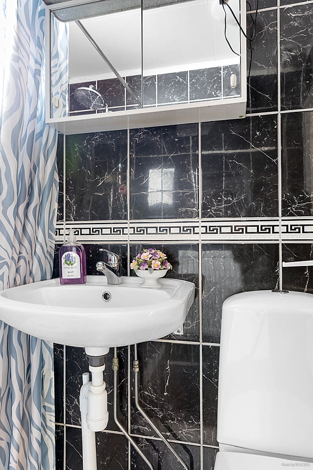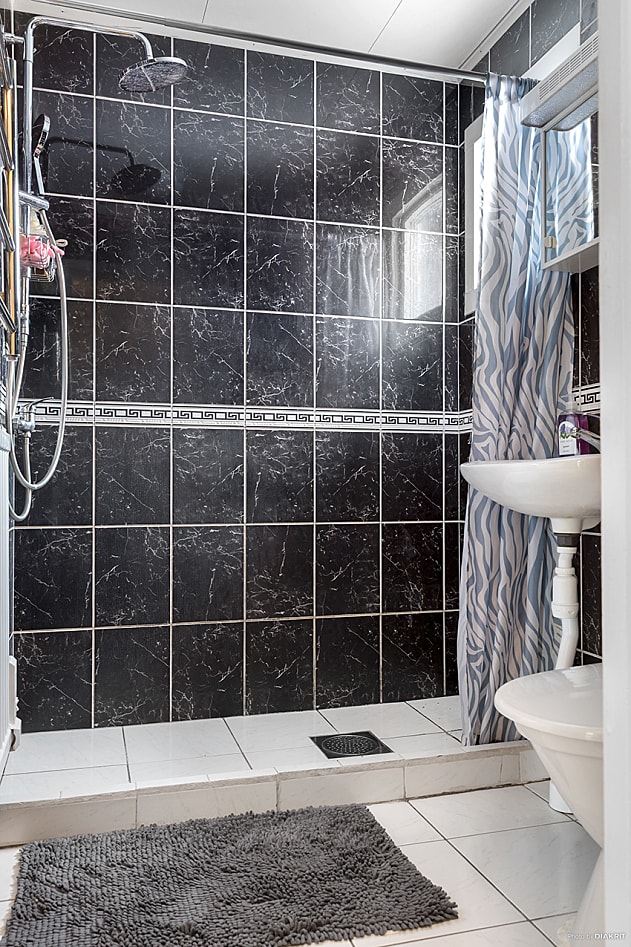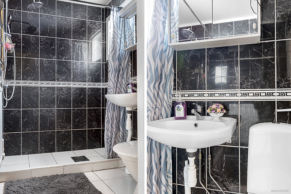 Helkaklat badrum med vita klinkerplattor och marmorerade svartkaklade väggar. Utrustat med WC, handfat med spegelskåp, dusch samt ett praktiskt vädringsfönster.