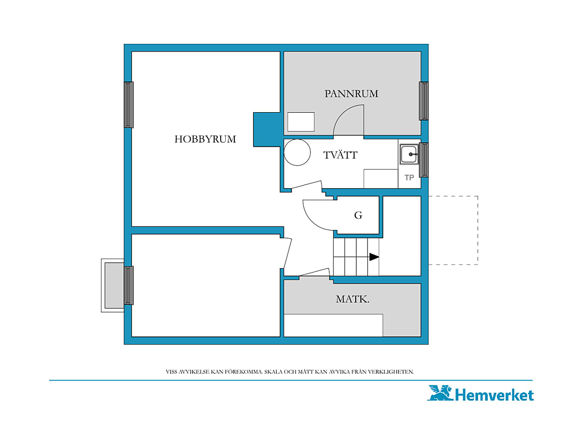 Källarplanet erbjuder generösa ytor med ett rymligt hobbyrum, pannrum och matkällare. Här finns även en praktisk tvättstuga med tvättmaskin, torktumlare och en funktionell tvättho.