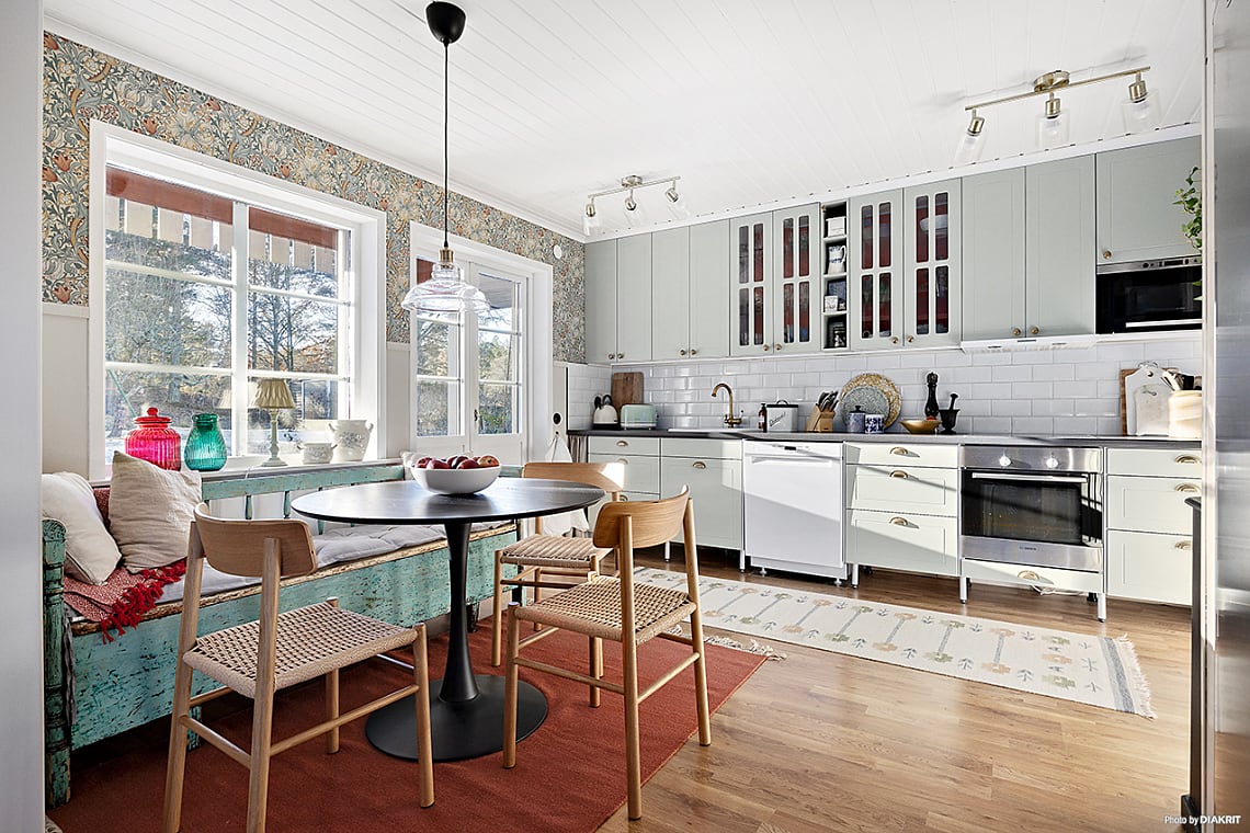 Målade väggar samt tapet av William Morris (2025). Laminatgolv.
