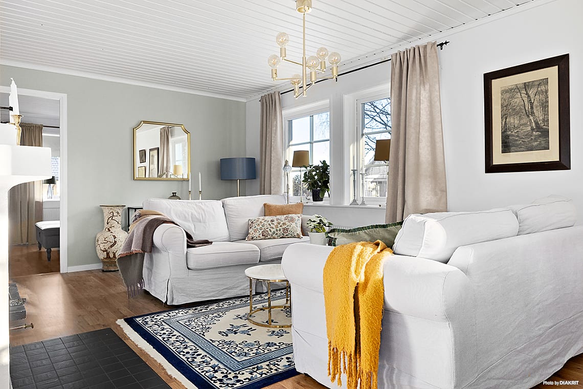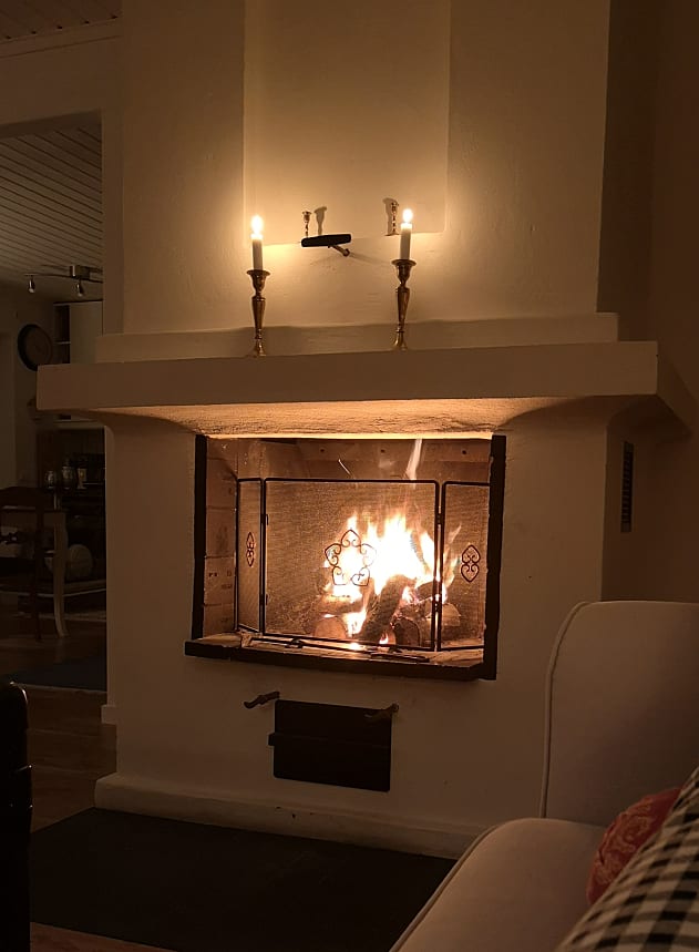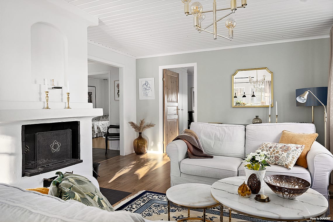 Rymligt och inbjudande vardagsrum med plats för soffgrupp med tillhörande möbler. Här finns en murad öppen spis i klassisk stil som värmer gott under årets kallare dagar.