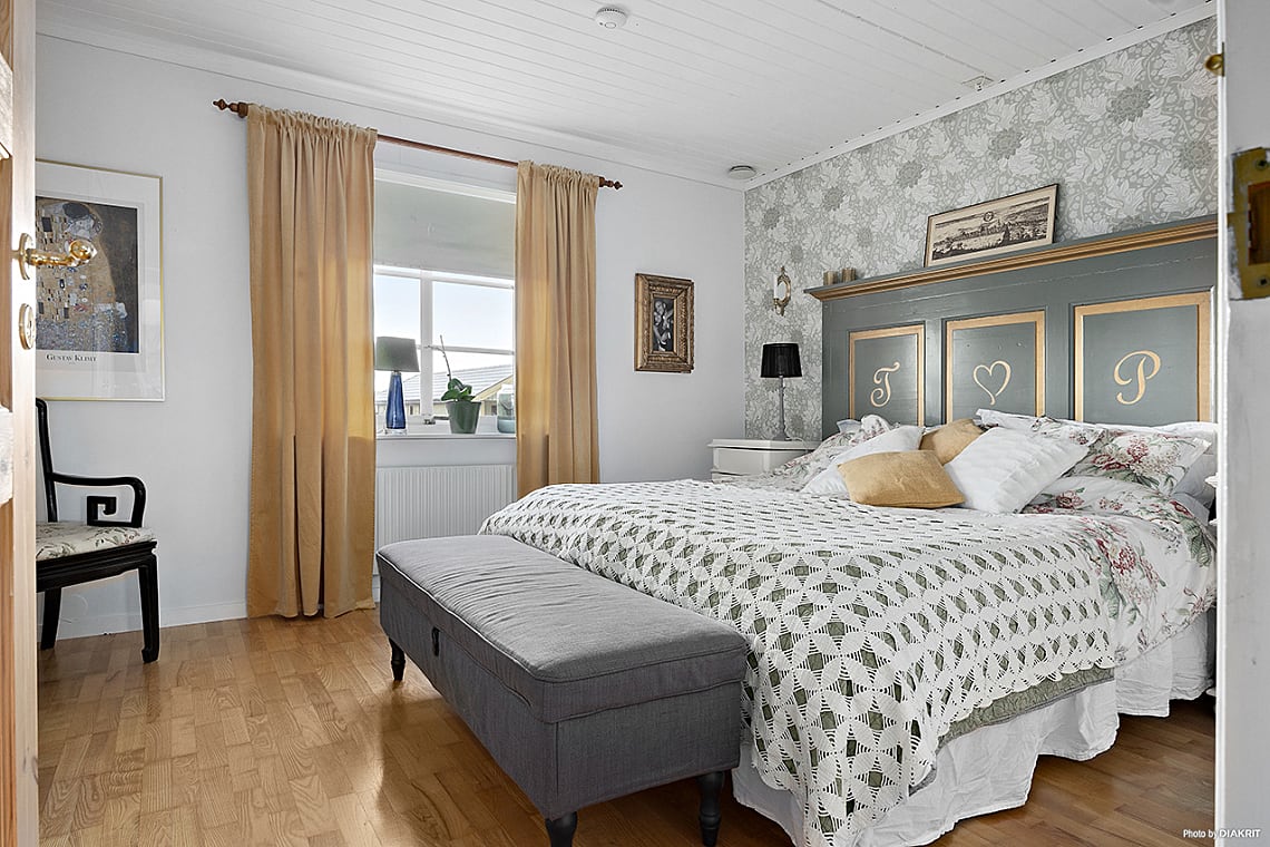 Fondvägg med tapet (2025), i övrigt målade väggar och parkettgolv. Fyra garderober.