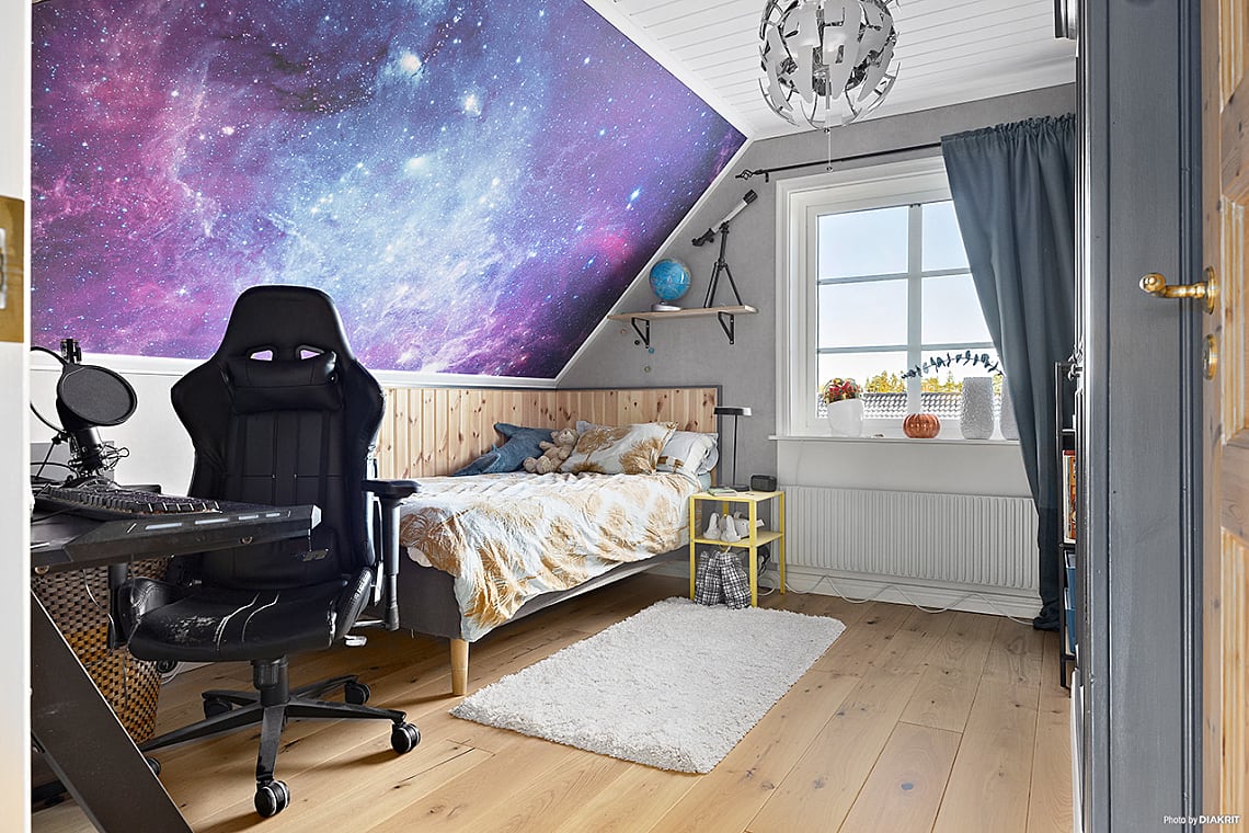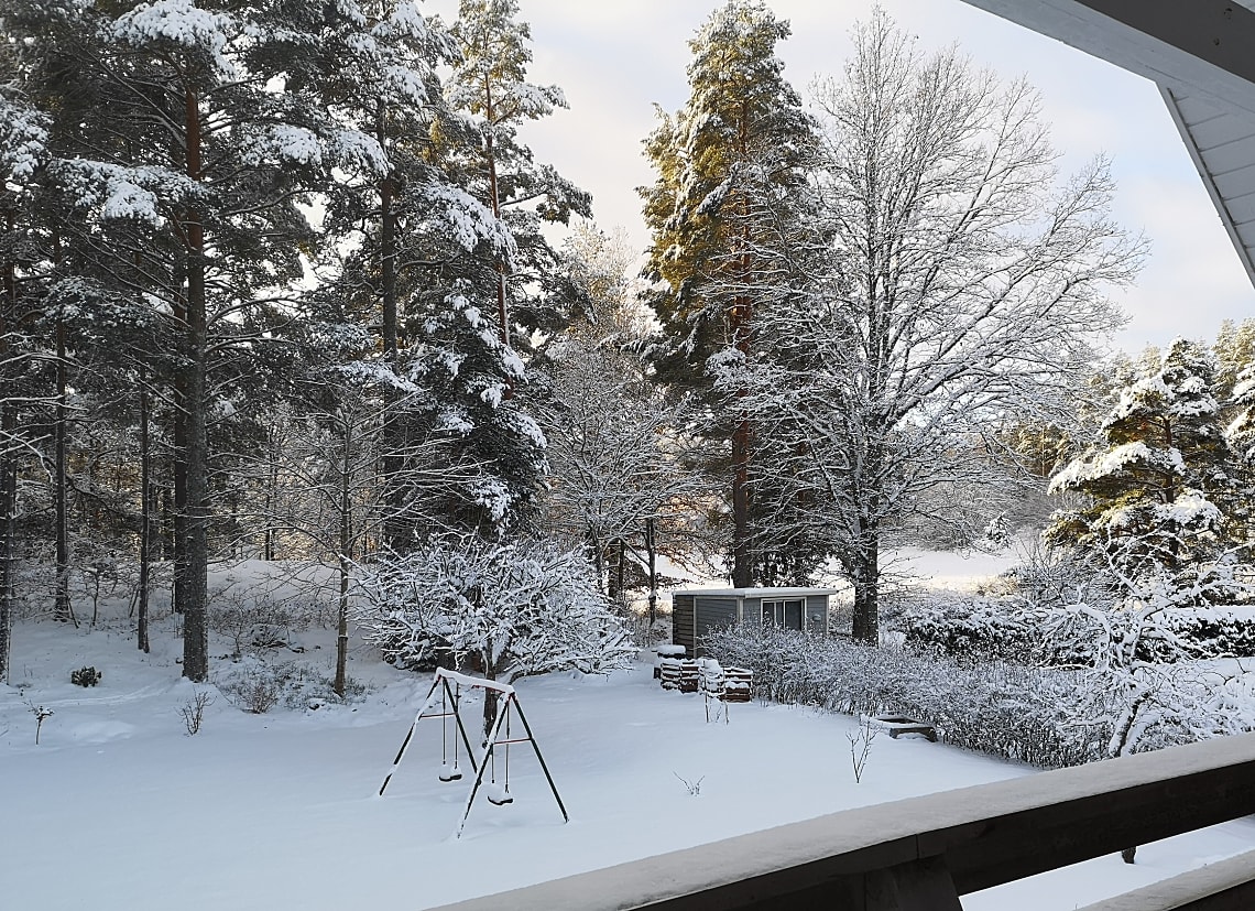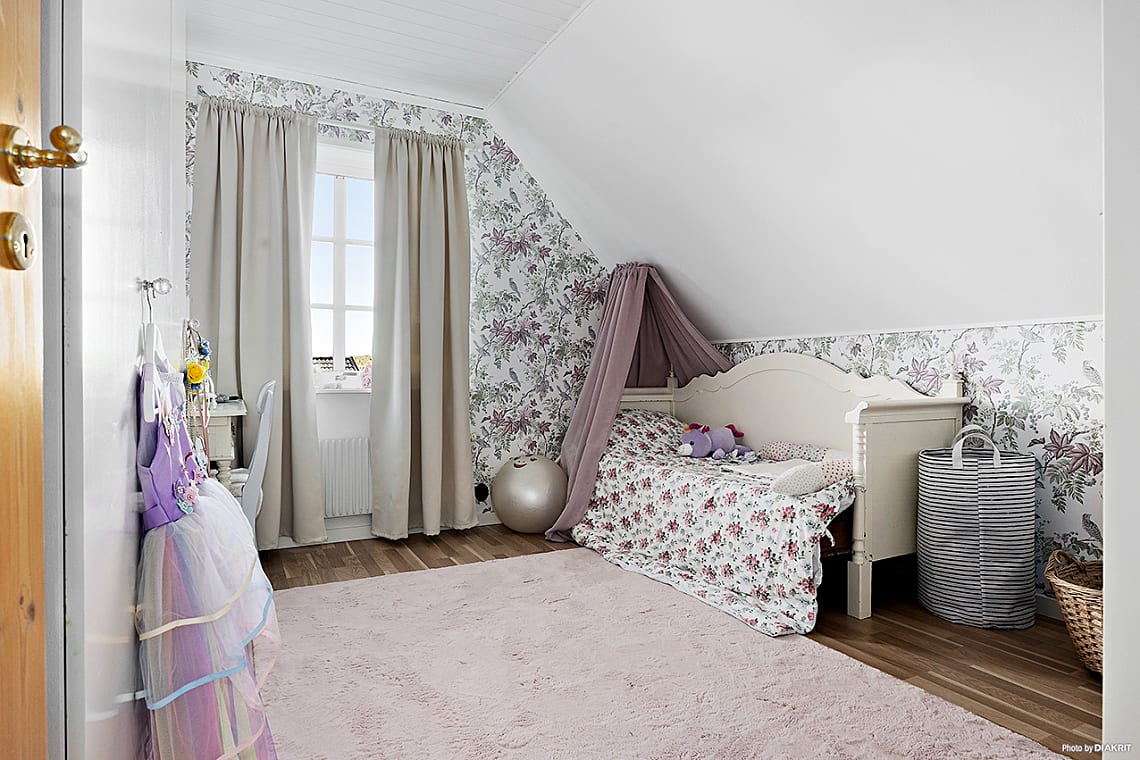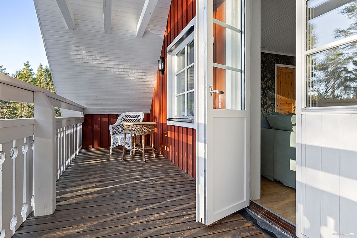 Fondvägg med tapet (2025), i övrigt målade väggar. Laminatgolv. Utgång till stor balkong i söderläge med utsikt över trädgård och skog.