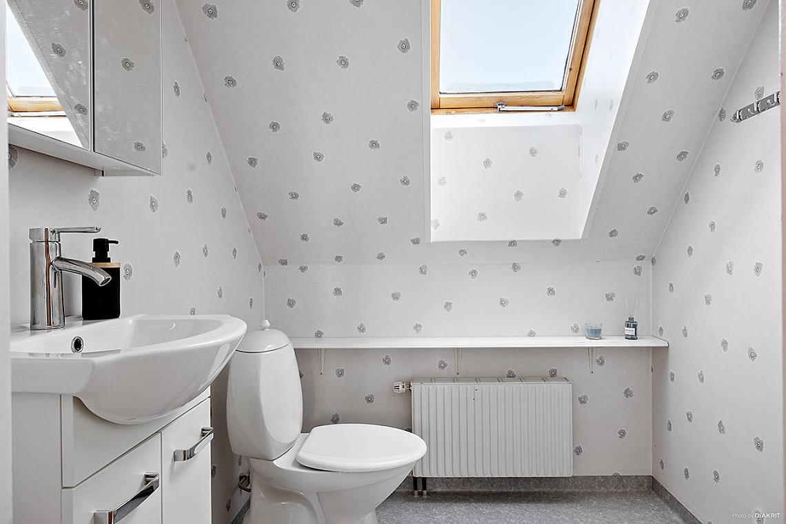 WC, nytt tvättställ, skåp, blandare och belysning (2025). Takfönster.
