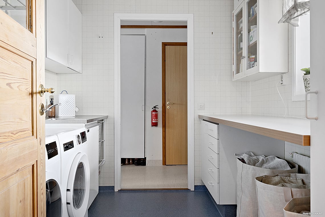 Våtrumsmatta på väggar och golv. Tvättställ med trådbackar. En garderob, ett städskåp, två överskåp samt rejäl arbetsbänk med skåp och lådor. Vägghängd torkställning.