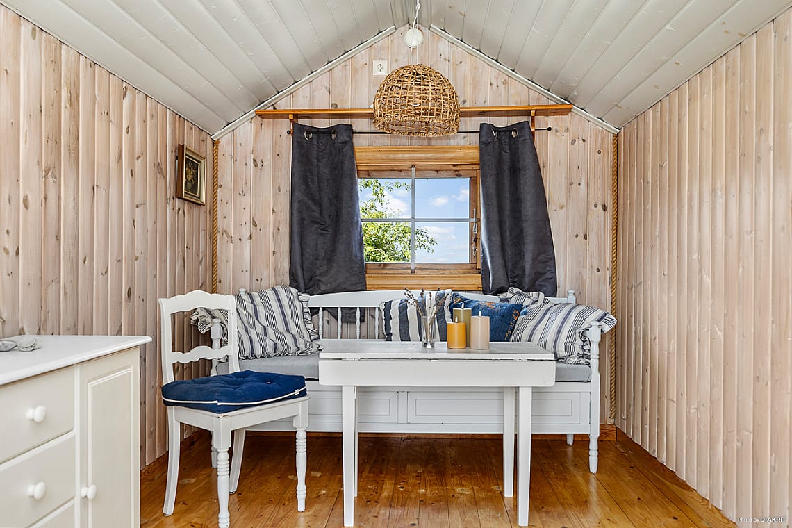 Möjligheter: Gott om plats för dagbädd, våningssäng, hyllsystem m.m.