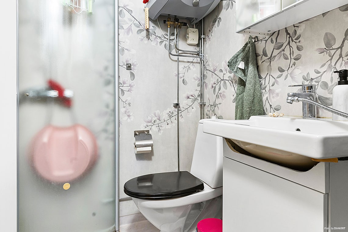 Ljust badrum med våtrumsgolv och våtrumsmatta. Här finns handfat i kommod, spegelskåp, dusch bakom glasdörrar samt vattenberedare.