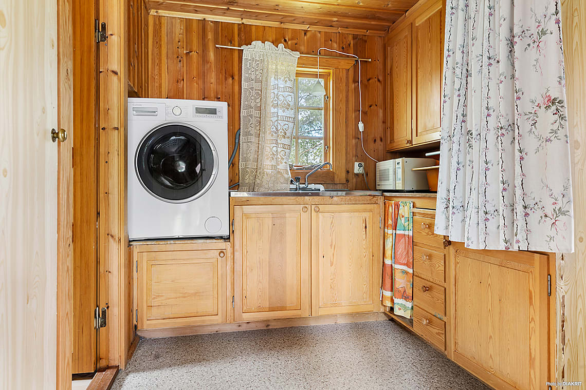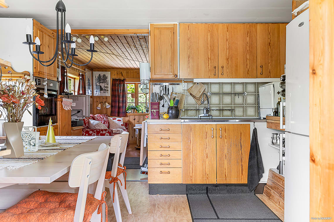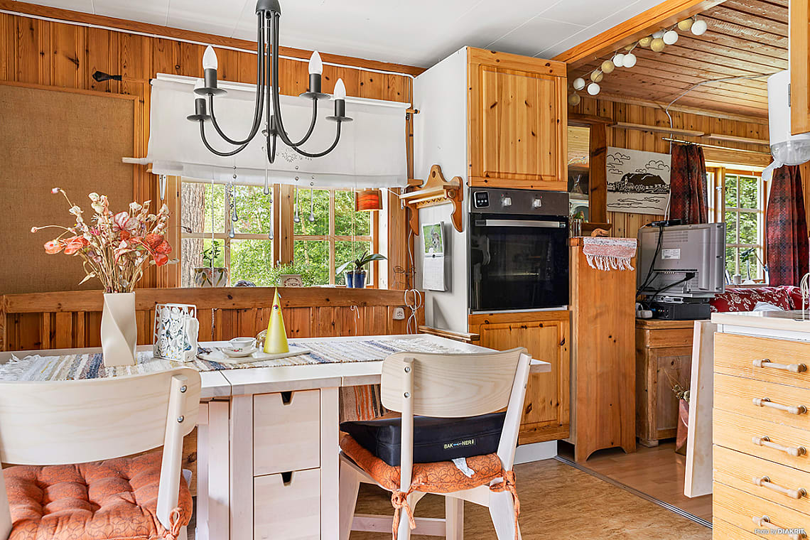 Rymligt och mysigt kök med generös skåpförvaring och arbetsyta. Intill fönstret finns plats för matbord. Köket är utrustat med inbyggnadsugn i bekväm arbetshöjd, kombinerad kyl/frys och spis.