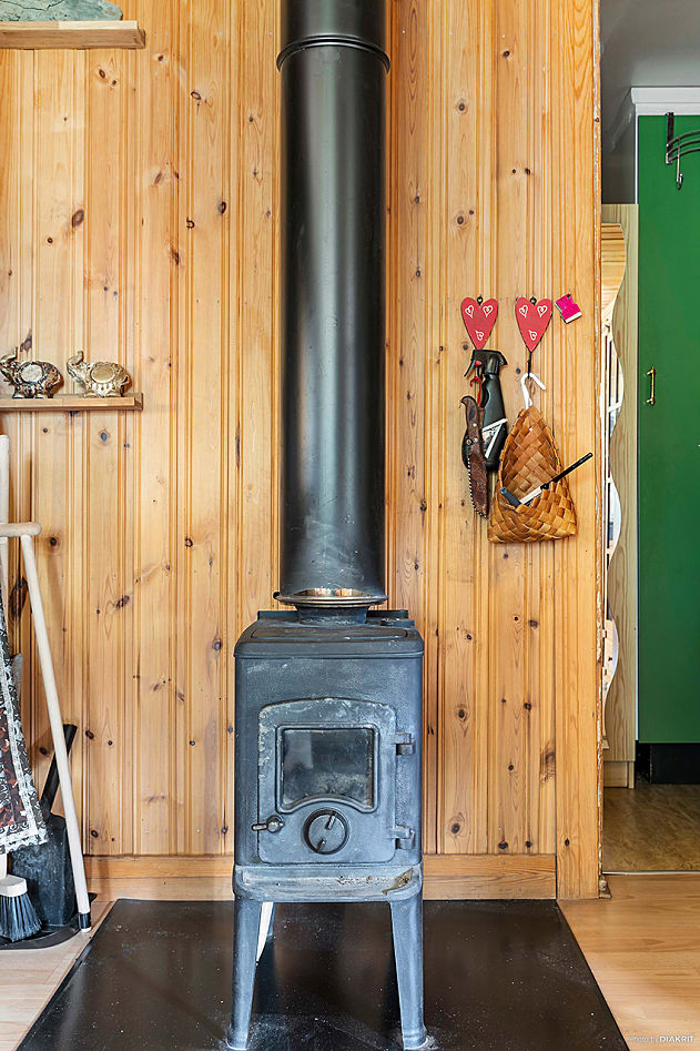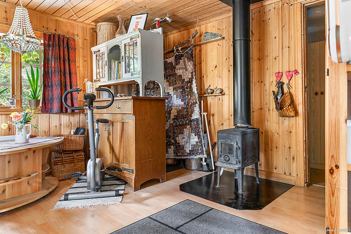 Allrum med plats för soffgrupp och mysig kamin som värmer under årets kallare dagar. Golv med klickgolv och väggar med träpanel skapar en varm och ombonad känsla.