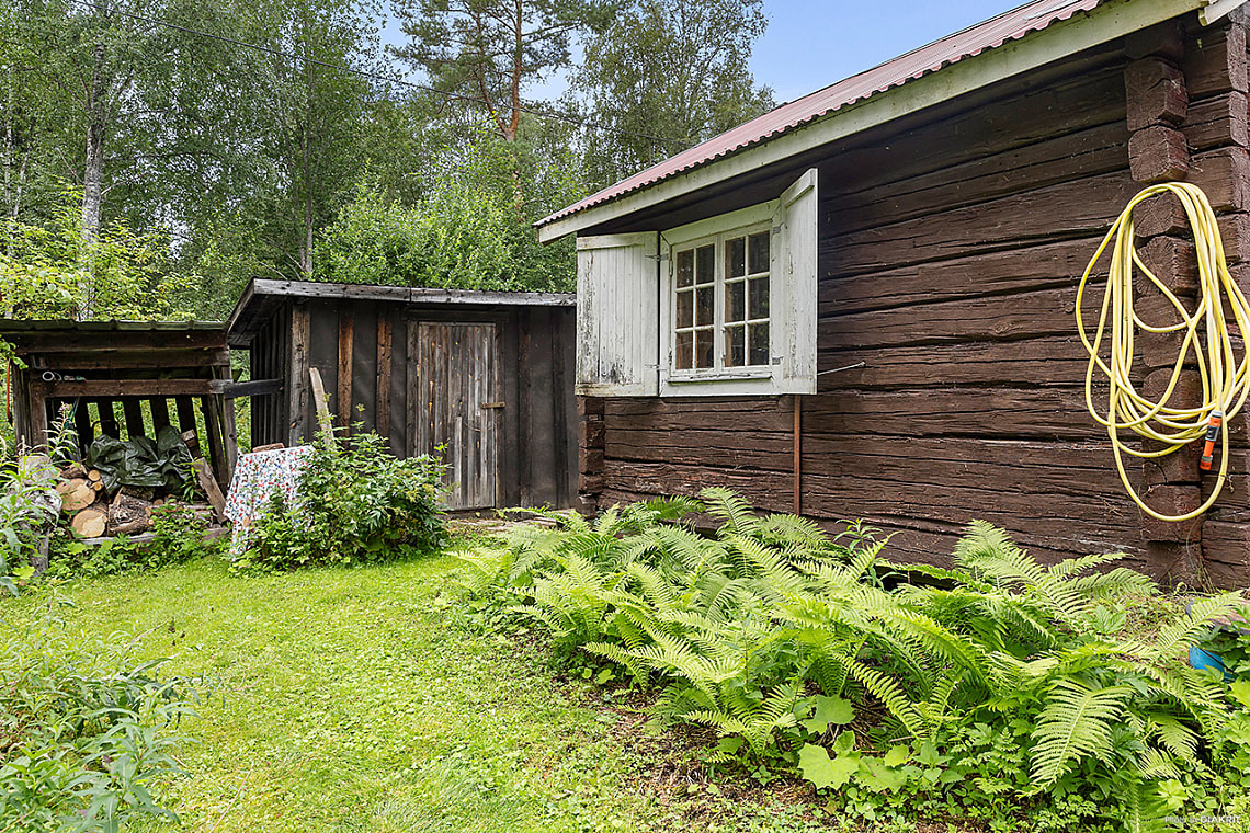 Separat förråd finns på tomten, samt ett vedförråd för praktisk förvaring av bränsle.