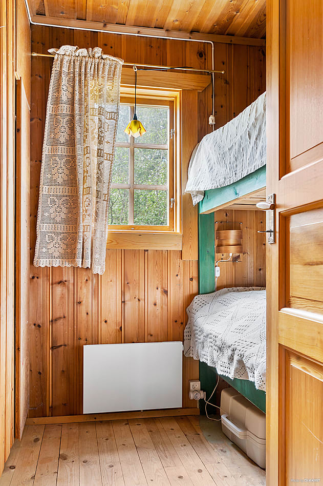 Sovrum med plats för säng och tillhörande möbler. Golv med matta och väggar i träpanel ger rummet en trivsam atmosfär.