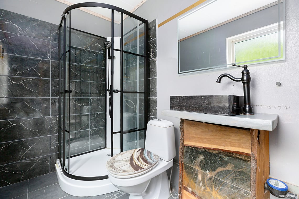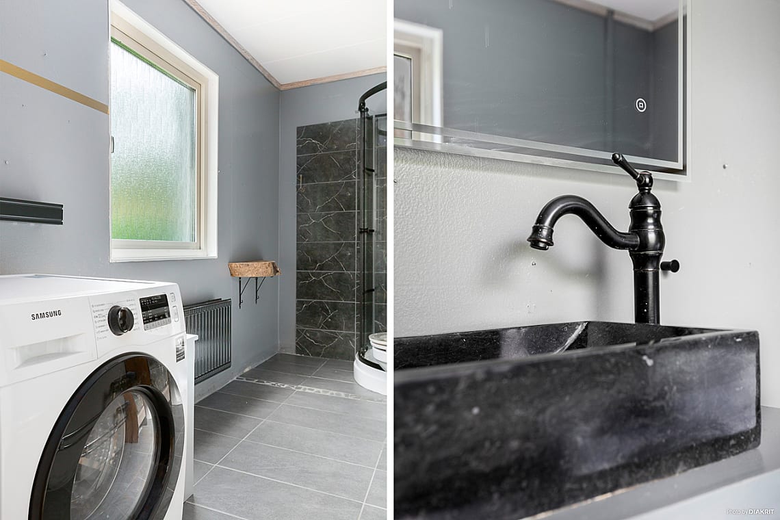 Badrummet renoverades 2022 med nytt klinkergolv och målade väggar med våtrumsfärg. Här finns toalett, handfat med kommod, duschkabin och tvättmaskin.
