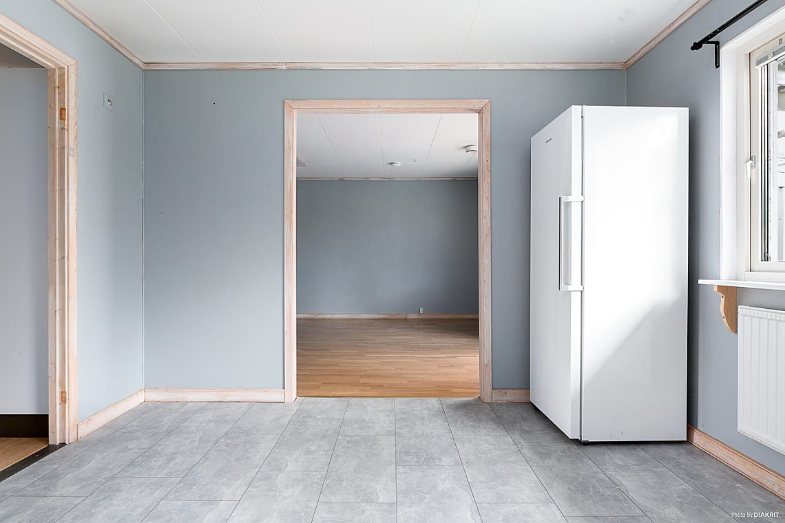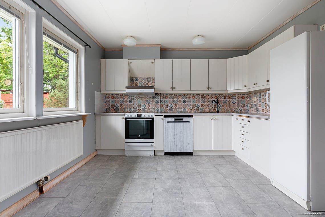 Köket har laminatgolv och är utrustat med ett mönstrat stänkskydd, spis, fläkt, diskmaskin (2021), frys (2021) samt kylskåp. Här finns gott om arbetsytor och plats för förvaring.