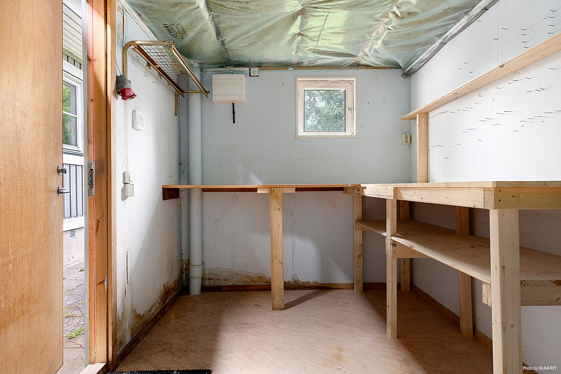 Isolerat garage med plats för bil. Rymlig ingång som tidigare nyttjats som snickarbod.