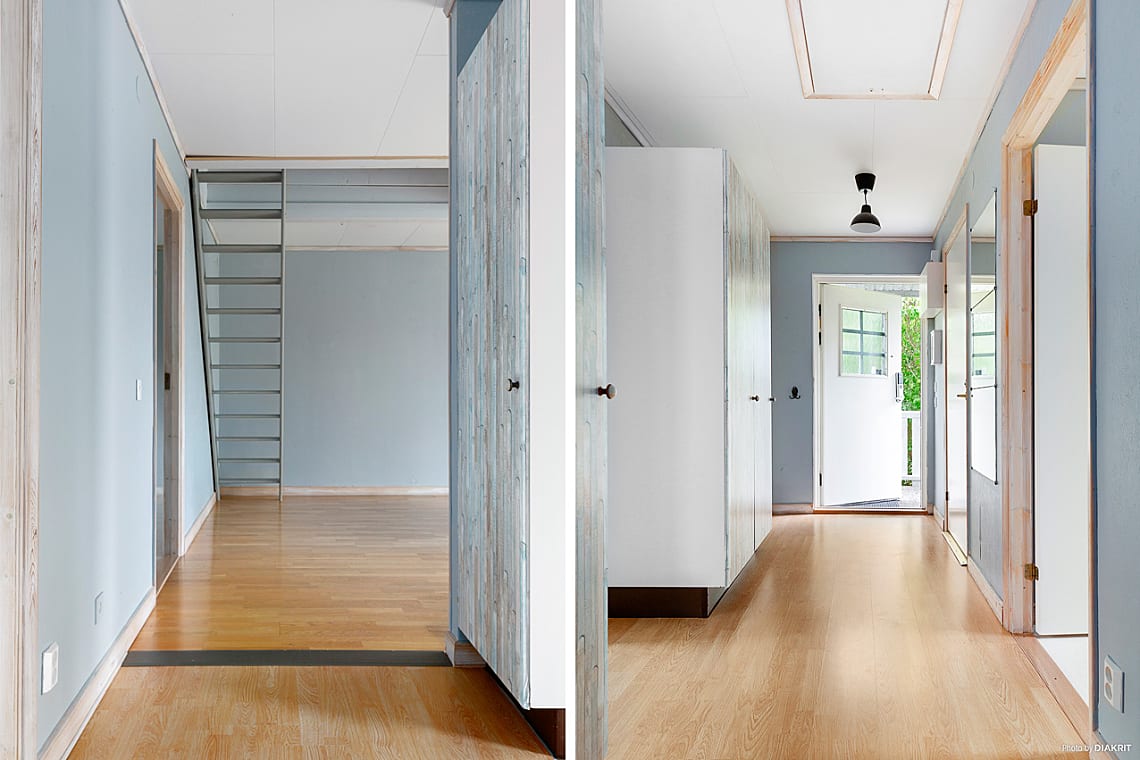 Ljus hall med laminatgolv, målade väggar och garderob för praktisk förvaring.