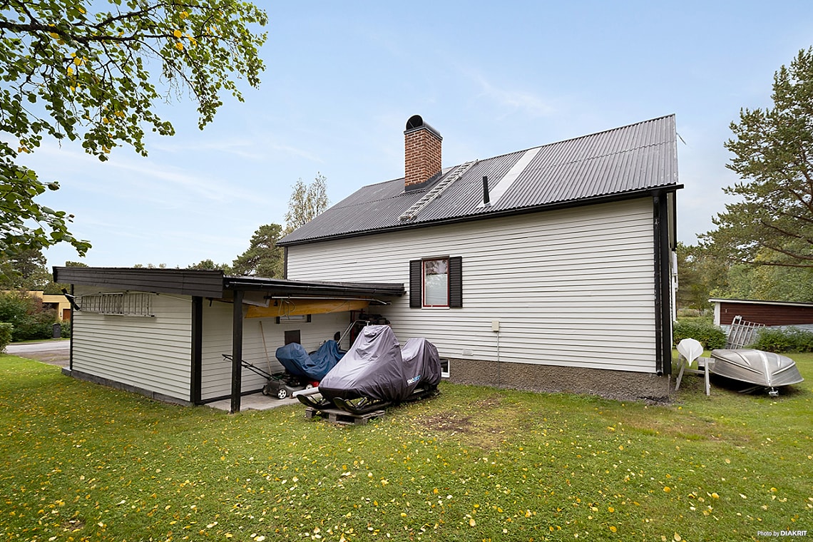 Här finns dessutom ett rymligt garage som breddats med 4,60 cm med plats för en bil och praktisk ingång direkt från källaren. På uppfarten ryms ytterligare tre bilar, och en friggebod om 10 kvm ger extra förvaringsutrymme. På baksidan är garagetaket förlängt med 110 cm – perfekt som regnskydd för gräsklipparen eller annan utrustning.