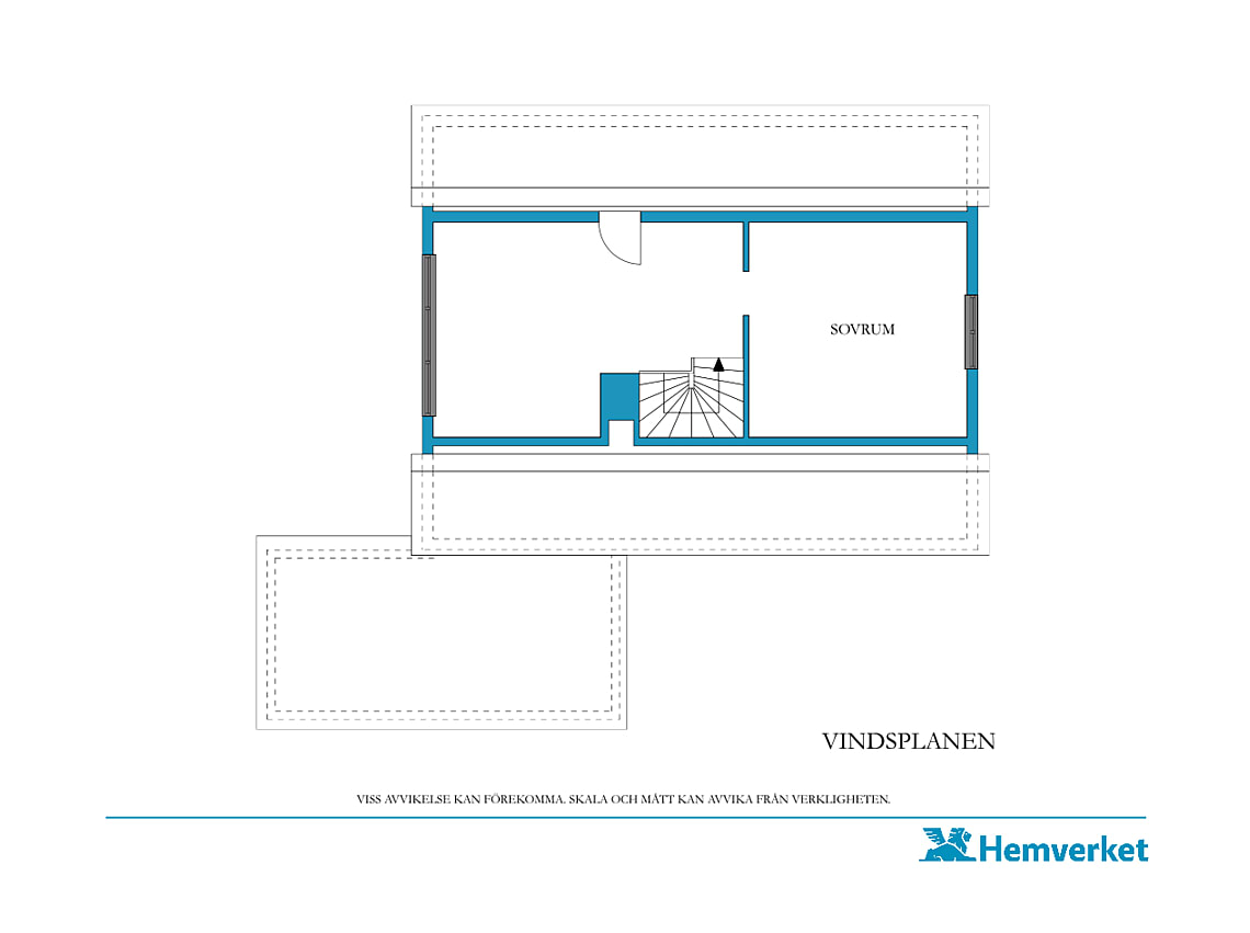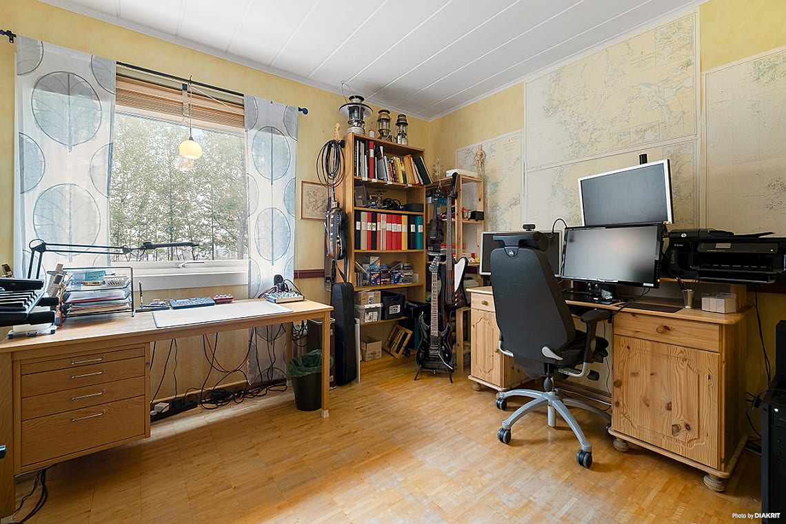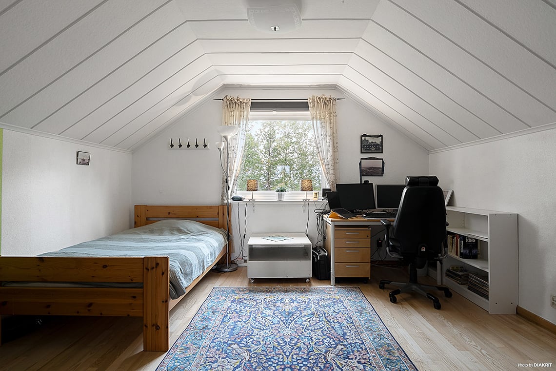 Används idag som kontor men kan med fördel nyttjas som sovrum. Rymmer kontorsmöbler eller säng med tillhörande möbler.
