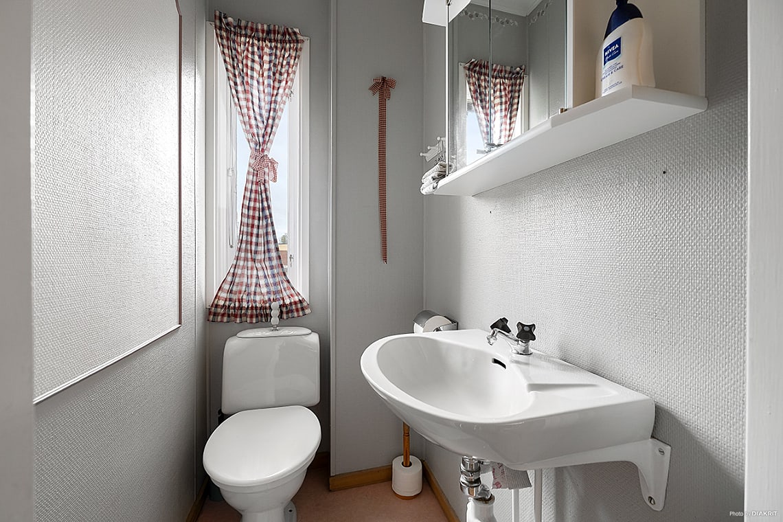 Praktisk toalett med våtrumsmatta och våtrumsväggar. Utrustad med wc, handfat och spegelskåp.