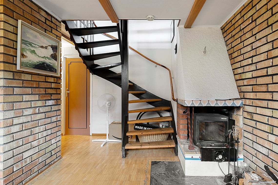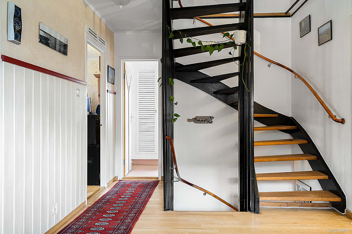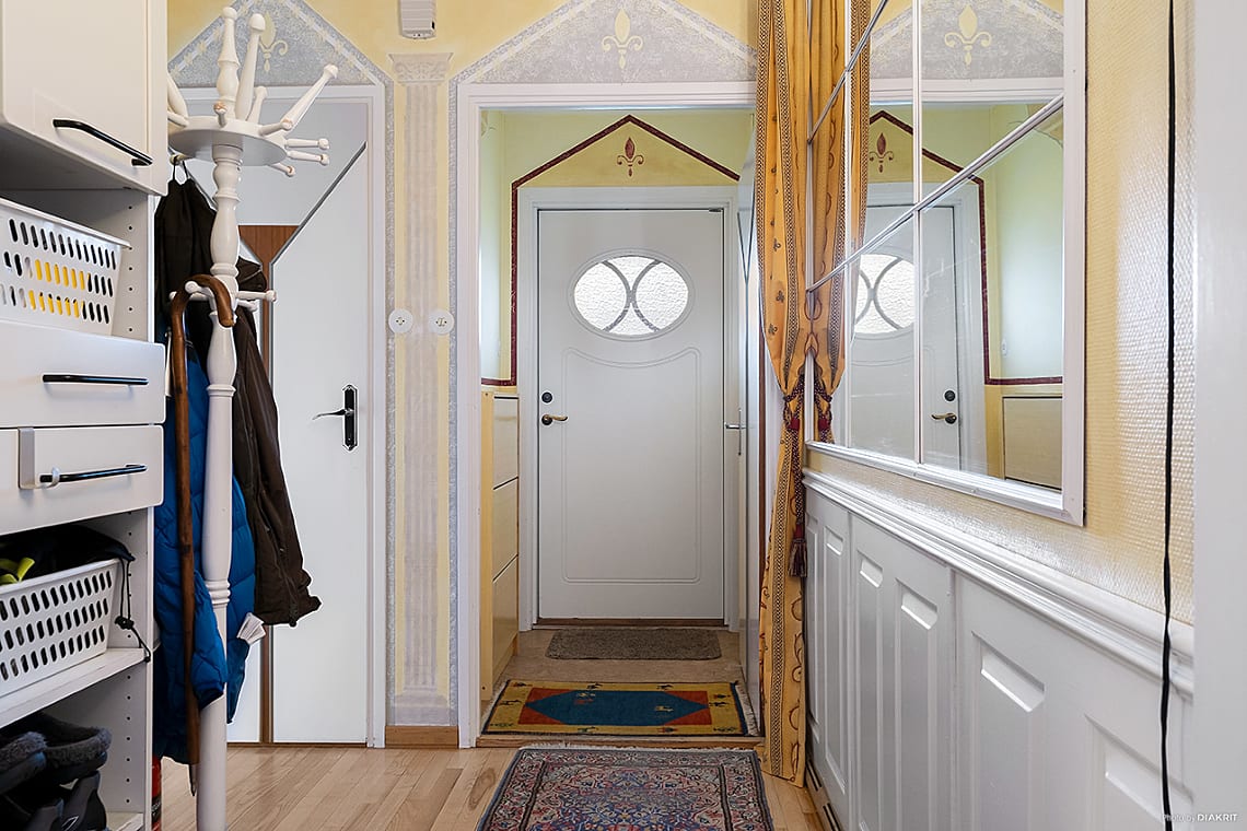 Välkomnande hall med gott om plats för kläder och skor. Härifrån nås trappan upp till övre plan samt ner till gillestugan.