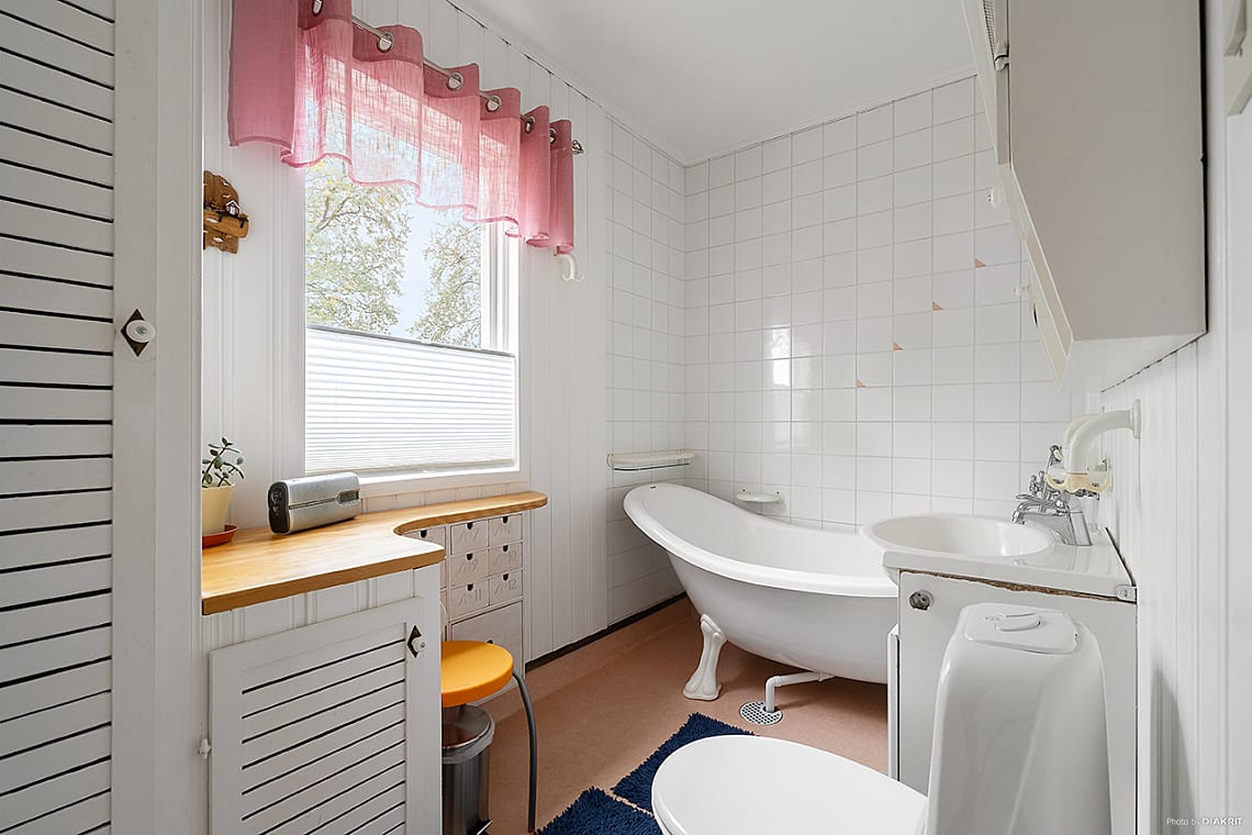 Fräscht badrum med kaklade väggar och våtrumsgolv. Här finns handfat i kommod, wc, badkar samt förvaringsskåp och arbetsyta.