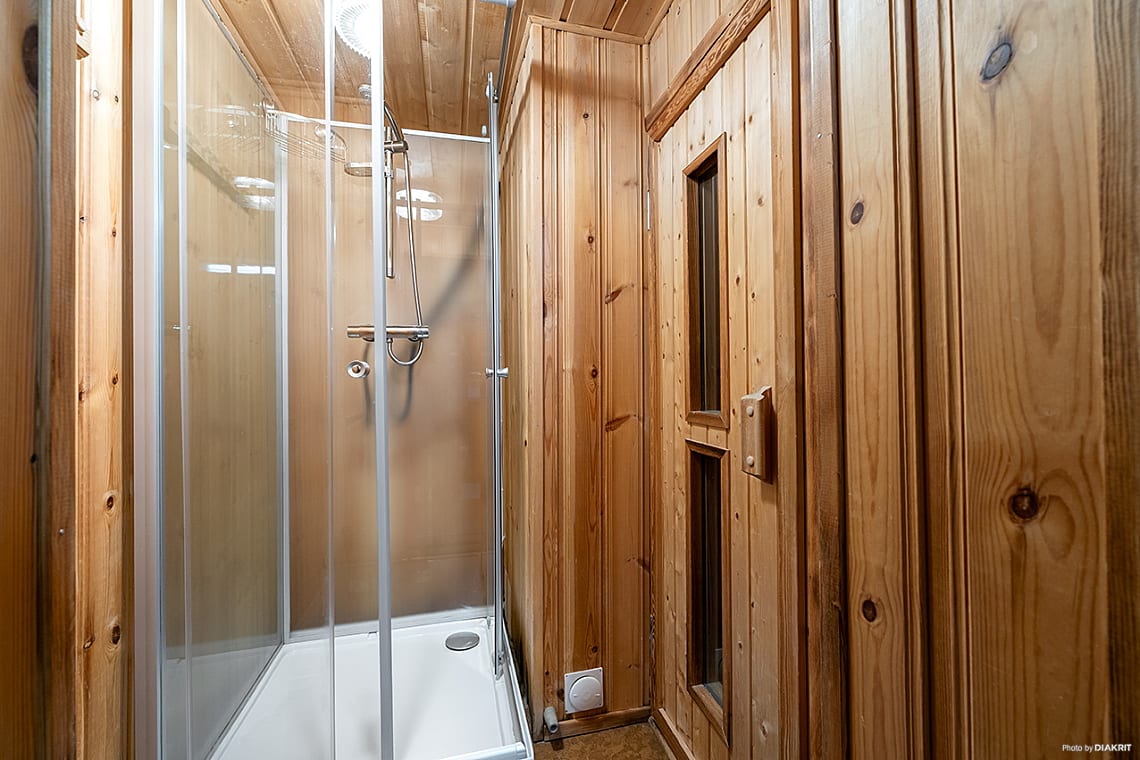 Praktisk tvättstuga samt duschrum och bastu, fördelat på tre separata rum.