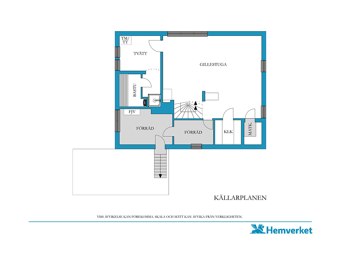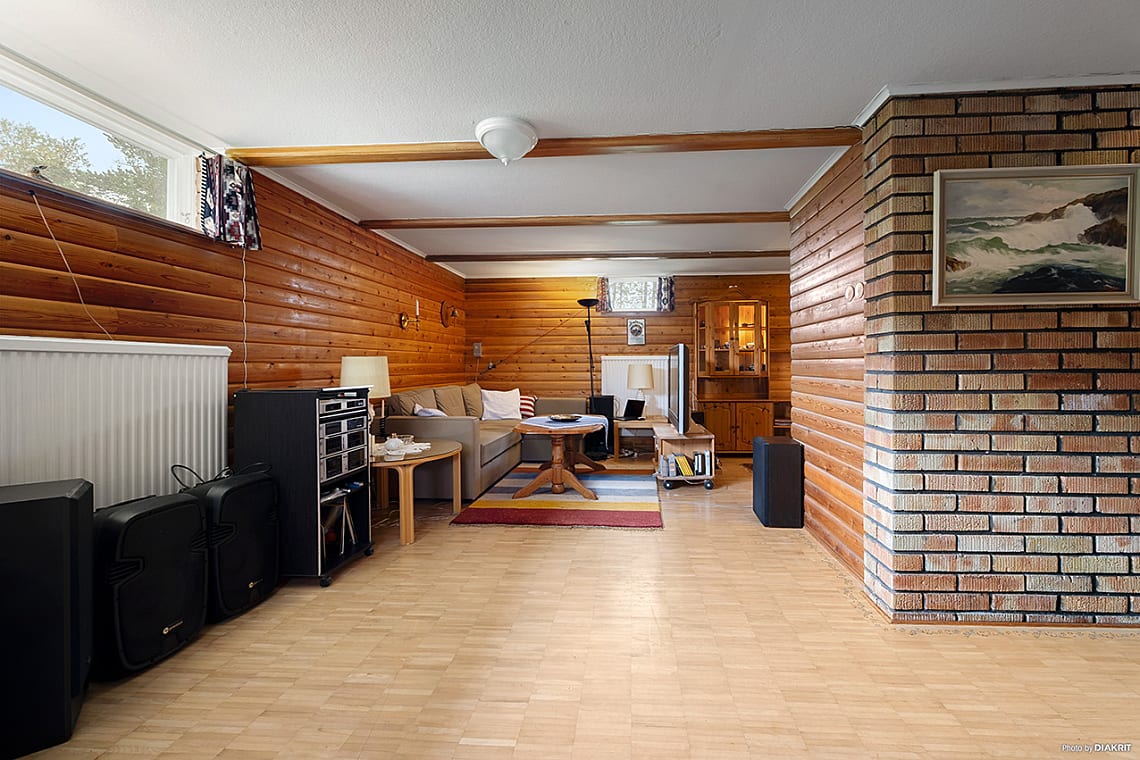 Stor gillestuga med plats för soffgrupp och sociala ytor. Här finns även en värmande kamin samt väggpanel som ger rummet karaktär. Intill finns ett extra förråd.
