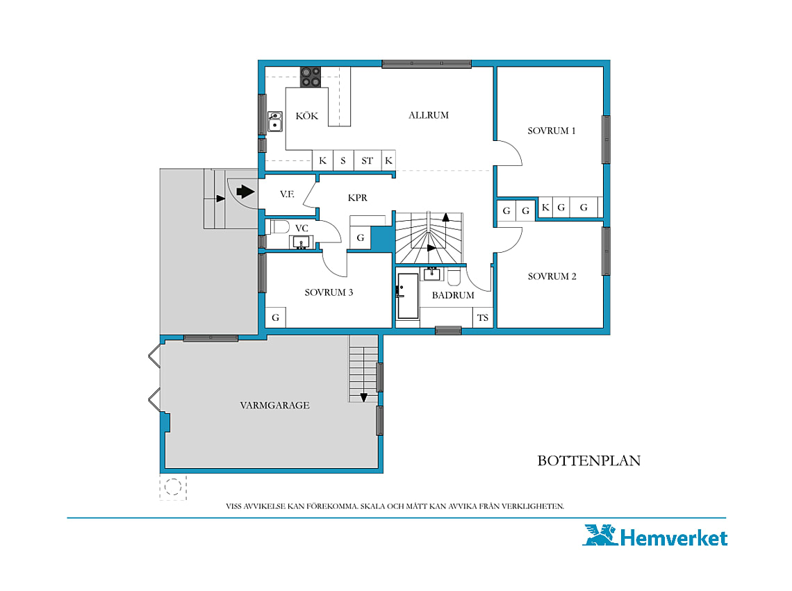 Till huset hör ett rymligt varmgarage med gott om plats för bil och förvaring. Utöver detta finns praktiska förrådsutrymmen som gör det enkelt att hålla ordning på verktyg, fritidsutrustning och trädgårdsredskap.